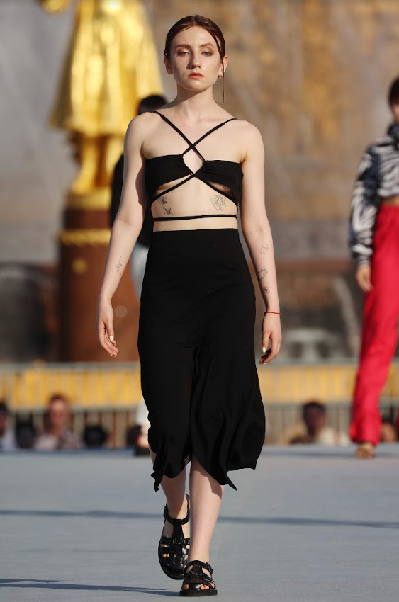 Another emerging brand from the capital brought its collection to the catwalk at Zaryadye Park. This was something of a show that started with dancing and ended with it, too. Models walked down the catwalk to dynamic music, presenting men’s and women’s outwear – hoodies, T-shirts with timely inscriptions and prints, cargo pants, bomber jackets, and open shoulder dresses. The color palette featured black and khaki. Playing with shapes, texture, and decorations, the designer managed to create hooliganish sets, featuring punk and streetwear aesthetics.
