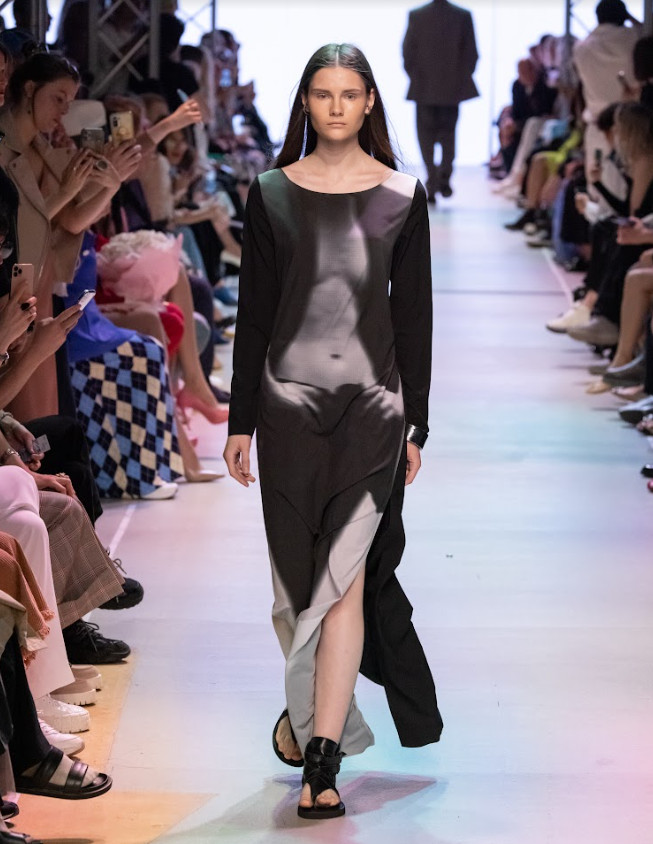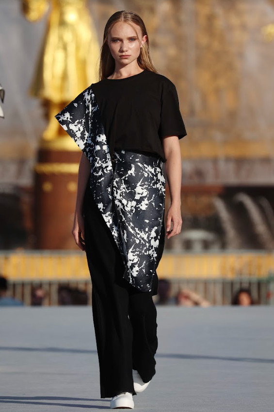 The brand from Buryatia established by Nadezhda Abzaeva, presented its collecting merging the real world and the 3D reality. The show started with some atmospheric video art, and then the 1st model wearing a floor-long overcoat and a balaclava hit the road. The collection comprised bomber jackets with extensive long sleeves, peculiar puffed tops, slim one-piecers, texturized jackets, cropped shirts, and asymmetric dresses. Carefully selected shapes of every piece had their part in making the looks refined. Basic colors of the collection were greyish beige and black. The prints were tie-dyed manually, and water for painting them was used in all its three aggregate states – fluid, ice, and vapor.