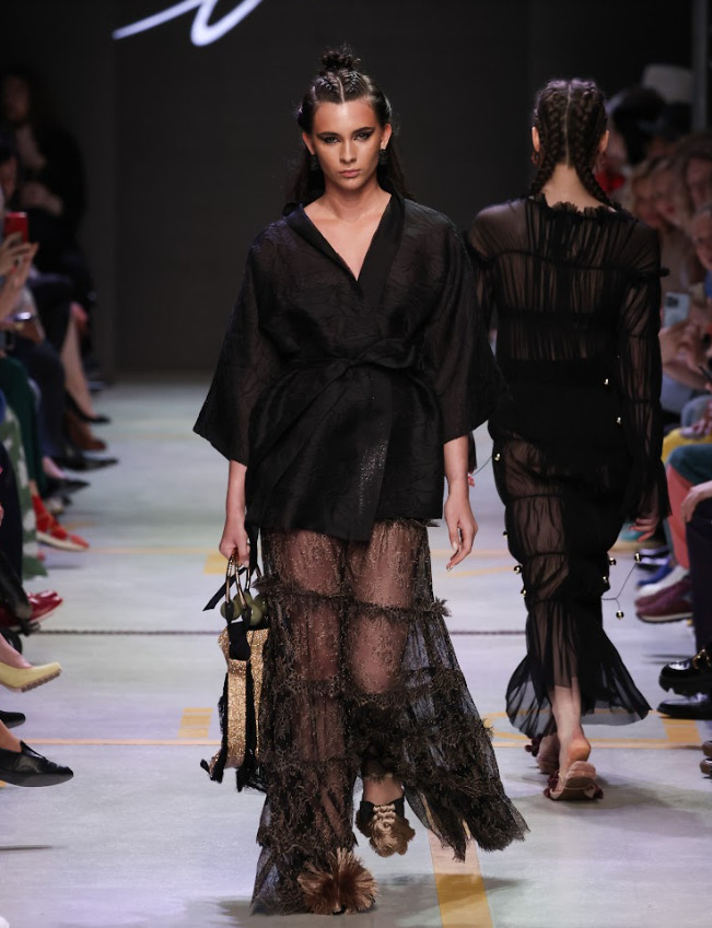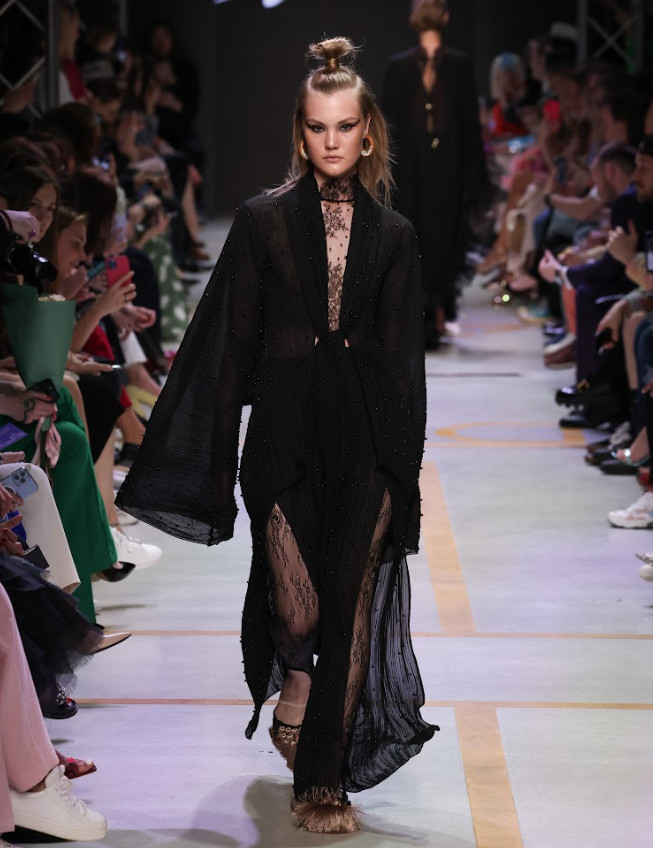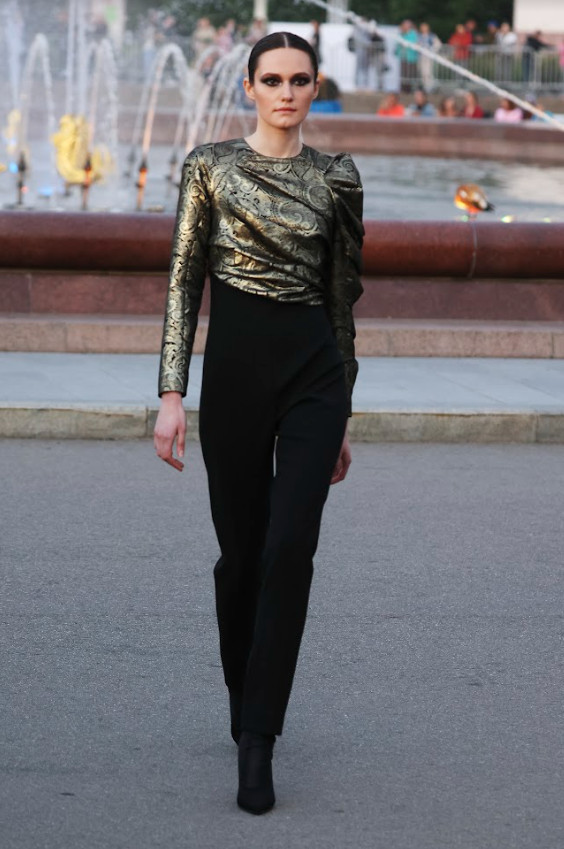 The new collection of the brand took the showgoers to the age of Rene Lalique, the jeweler. Images of jewelry pieces made by this glass designer on backs and sleeves of the garments became tickets to the time machine. Basic materials of the collection were Italian corduroy and finely radiant viscose. The catwalk was full of aery tops with draperies, asymmetrically cut blouses, corduroy suits with loose rims, wide streamy pants, and semi-tight skirts. The key accessory in most of the looks was transparent veil.