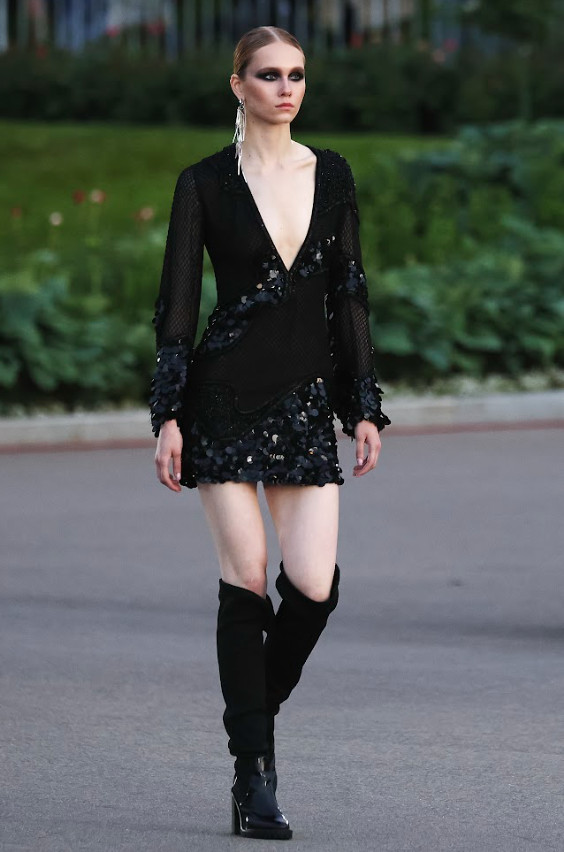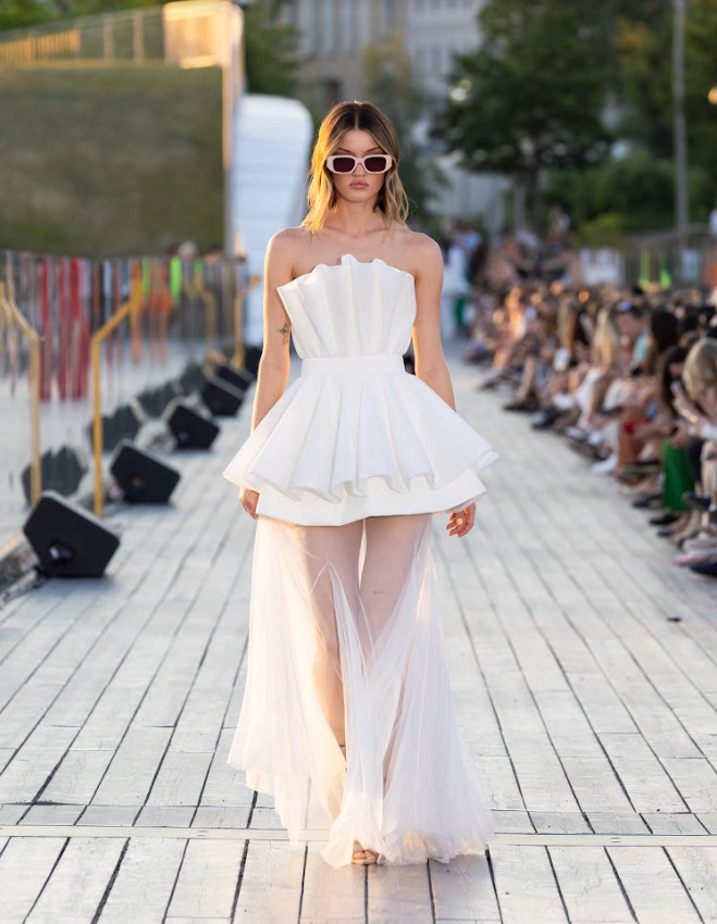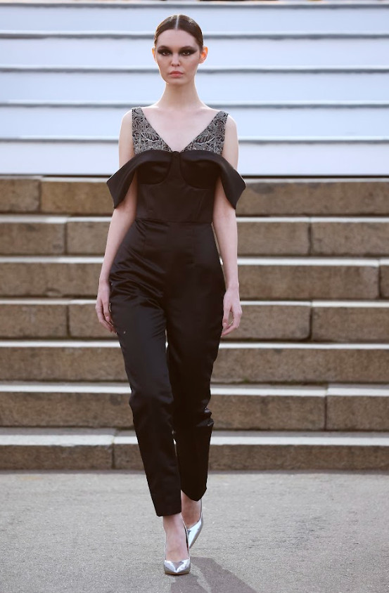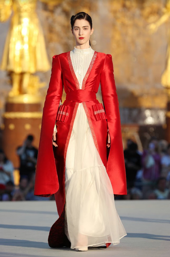 Valentin Yudashkin presented his Haute Couture 2022 collection at the Floating Bridge in Zaryadye Park. The fashion master was inspired by high jewelry art of Bvlgaru House which has been working for 130 years already. The overcoats with precious stones or extensive sleeves, shimmering jackets and suits, floor-long dresses, and jacket-dresses with prints, palazzo pants made of streamy fabrics, and tailed capes looked especially remarkable against the sunset lights. Some of the looks were topped with balaclavas and collars decorated with handmade embroidery. The highlight of the collection were dresses patterned with precious stones, decorated with natural pearls, embroidered with beads, all of these featuring black and gold. Draperies, sophisticated contours, impeccable shapes, careful work with fabrics, and production quality were – as always – best of the best. During this show, beauty, elegance, grace, and top quality ruled the day.