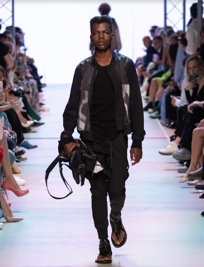 As usual, a St. Petersburg based designer Ianis Chamalidy brought a collection that was mainly black. Clothes are designed for real people, but not without a hint of Avant-garde – this is what one might say about the new DIVIDUUM collection, both austere and graphic. Both men’s and women’s looks were demonstrated at the catwalk. Womenswear included volant maxi dresses, wide trousers and shorts accompanied by translucid bras, trousers suits, extended jackets, and classic overcoats. Menswear comprised plain two-piece suits accompanied by semi-transparent shirts; suit coats decorated with fine chain strings; wide shorts; and irregularly cut tank tops.
