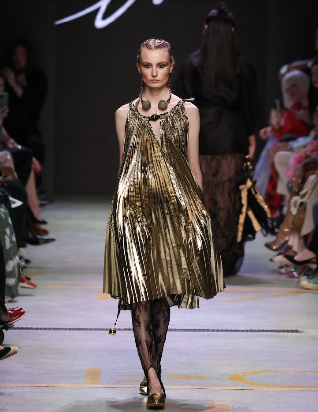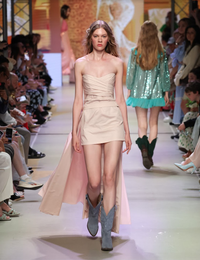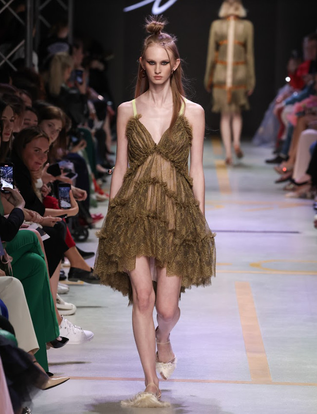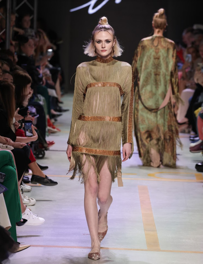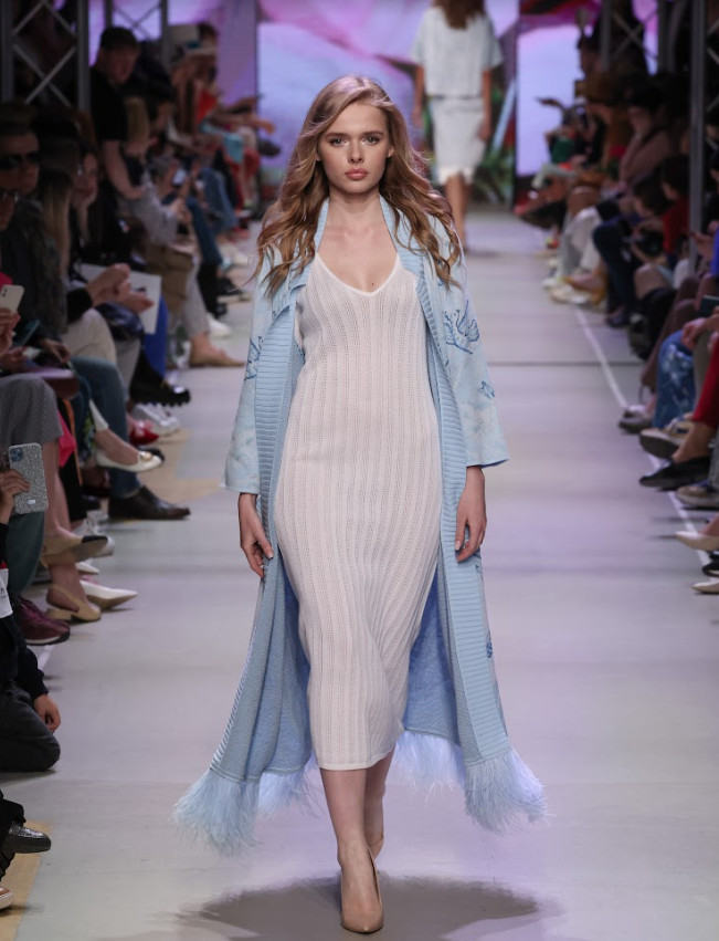 Designer Evgeniya Linovich states that there is always a reason to dress up, and she creates garments for special occasions. The show started with acapella performance of the Comets song (polnalyubvi) and continued with a smooth dancing sketch. Basically, the collection featured feminine dresses accentuating body contours, all of them light white, beige, menthol green, and pink. Sequins set up the mood, and the looks seemed perfect for any occasion. Satin, lace, flowing and airy fabrics were chosen to highlight elegance, shine, and easiness.