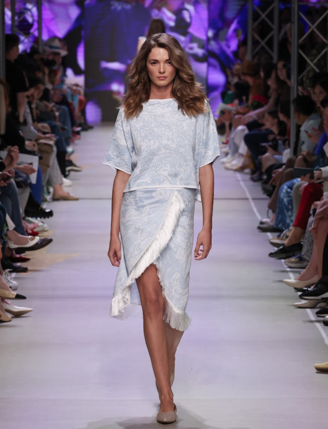 Designer Svetlana Shatunova presented a sea cruise like collection, inspired by Pre-Raphaelite paintings and her vision of a she-Muse. In her line, classic silhouettes were merged with airy fabrics and floral prints, granting the collection a light and easy spirit. Models walked down the catwalk in trouser suits, romantic dresses – laced and fringed, knitted bra and shorts, pajama-style sets, and a super-light organza trench coat. The final chord was the wedding look – a minimalist dress with a gentle veil.