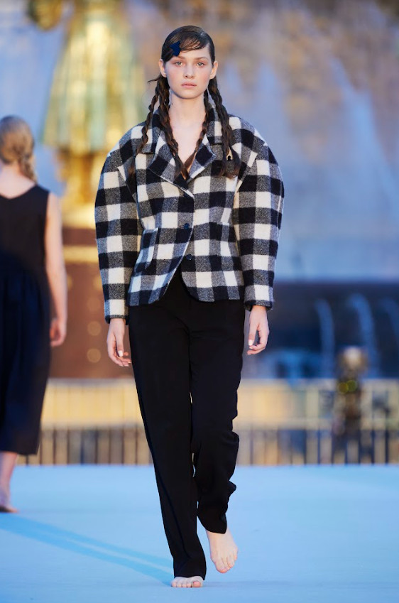 Top View collection by the Moscow-based STUDIO 29 was inspired by landscapes observed from an airplane’s window. Designer Tanya Fomicheva reconsidered mosaic landscapes, tree tops, thick mountains and hills, fine lines of villages and cities, and curved rivers. All of these were recognizable in the new womenswear collection – vivid colors, bold textures, fittings, structural lines, and silhouettes. Monochromic and chequered overcoats referred to endless natural landscapes. Trouser suits and longsleeves all in curved lines entwined the models’ bodies as river beds. Striped jersey made show goers think of the horizon. All the looks were accompanied with thoroughly chosen accessories – hats, scarves, and bonnets. For the first time ever, the brand made a bag – it was coat fabric of three colors, popular during this season. The collection presented at Moscow Fashion Week will be available for the buyers starting with August 1.