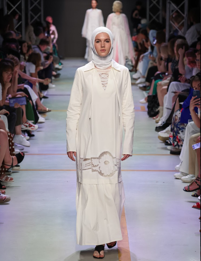 This emerging brand led by designer Zuhat Asekova adheres to modest fashion guidelines. The designer makes garments that cover the bodies all over but for hands and facial contours. At the same time, many models feature functional and well-considered solutions that can be used as independent combinations and long-sleeve dresses. This season, the collection was a new take on the cultural heritage – it seemed to refer to Vietnamese high slit tunics, Japanese kimonos, and Caucasian traditional garments that inherit Asian motives thanks to geographical proximity. Deconstruction-like elements combined with traditional keynotes was the designer’s meditation about contemporaneity and old times connected. Pinafore dresses with fine shoulder straps were presented worn over dresses, skirts were cut from altered pants, blouses and so many more elements featured silk organza. The choice of monochrome hues, metallic gloss, laconic elements like stripes or bows emphasized that modesty can be attractive.
