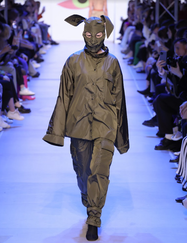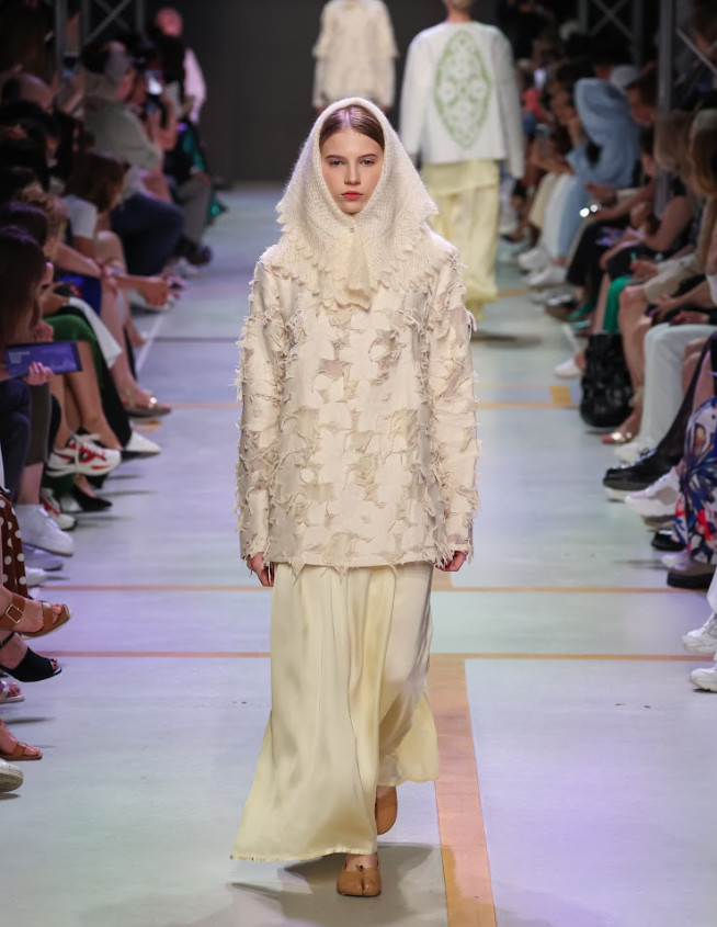 Elena Mezhova, the brand designer, had a go at showing a person’s wish to be closer to natural harmony. This was why she named every piece after a plant or an insect. Moscow Fashion Week goers were presented OSTREIDAE one-suiter, which repeated aesthetic features of an oyster, Hymenophore sportive suit, and Amanita dress with a skirt. Besides these remarkable pieces, the visitors were demonstrated free-cut shirts, unique T-shirts, and texturized pants, cropped tops with extra-long sleeves, suits with designer prints, underwear-like dresses, a straightly cut overcoat, and some oversize jackets. The most remarkable look was an extensive black dress with its hem made of waste bags. During a dancing performance, announced before the show started, this gown became an elegant one-piecer. 70% of the materials used to make this collection were recycled.