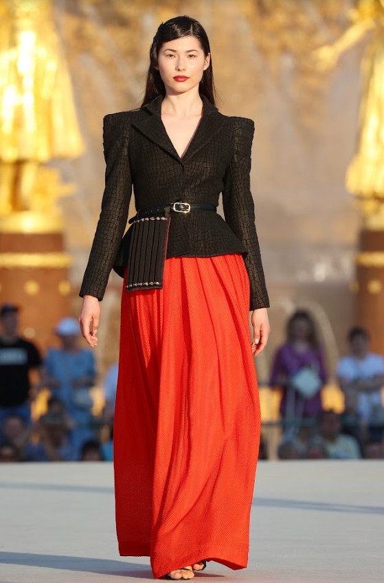 SERGEY SYSOEV presented their show at the Kitaygorodskaya Wall. Models walking down the catwalk presented vivid floral prints, dresses, skirts, and blouses embroidered, checkered pinafore dresses – natural-colored, overcoats, men’s suits with large flowers, and shirts. The basic print and the keynote of the collection was large chequers in various configs and combinations. Sophisticated hairdos of the models – victory rolls – were quite remarkable and perfectly topped austere and elegant looks. The color palette was a somber one – brown, beige, black with some highlights added by red poppies and other blossoms.