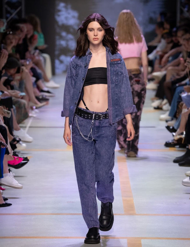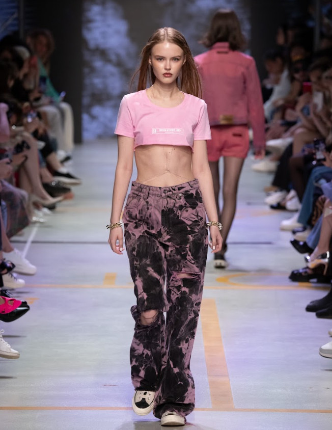 For 4 years in a row, Moscow-based designer Kostya Skorokhodov has been experimenting with customization. This was what led him to establishing his SHOCKING AFTERTASTE brand in 2020. Many show business people appreciated his bold solutions, including Egor Kreed, AllJ, Nyusha, Dima Bilan, Smokey Mo, Kizary, Mary Gu, Gosha Kartsev, Dina Sayeva, Maryana Ro, and many more. This season, Kostya presented his Reworked collection of 50 handmade men’s and women’s pieces. The collection seems to refer to cowboys and grunge punk music of the noughties. The range of colors covered many blends – from soft blue to classic punk-style pink and black. Every piece was unique thanks to upcycling, unusual tie-dye use, handmade stonewashing and etching. The trendy looks featured cargo pants, low waist jeans, crop tops, and oversize jackets.