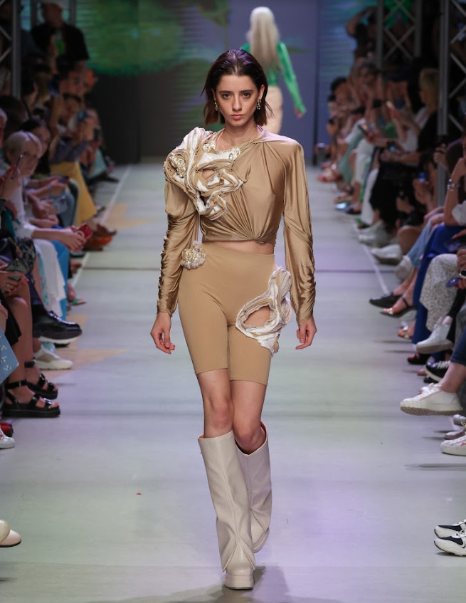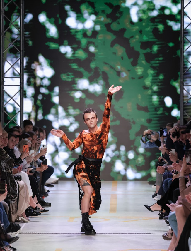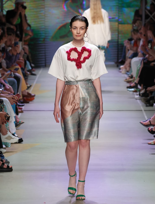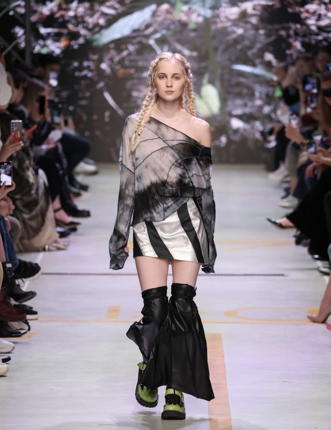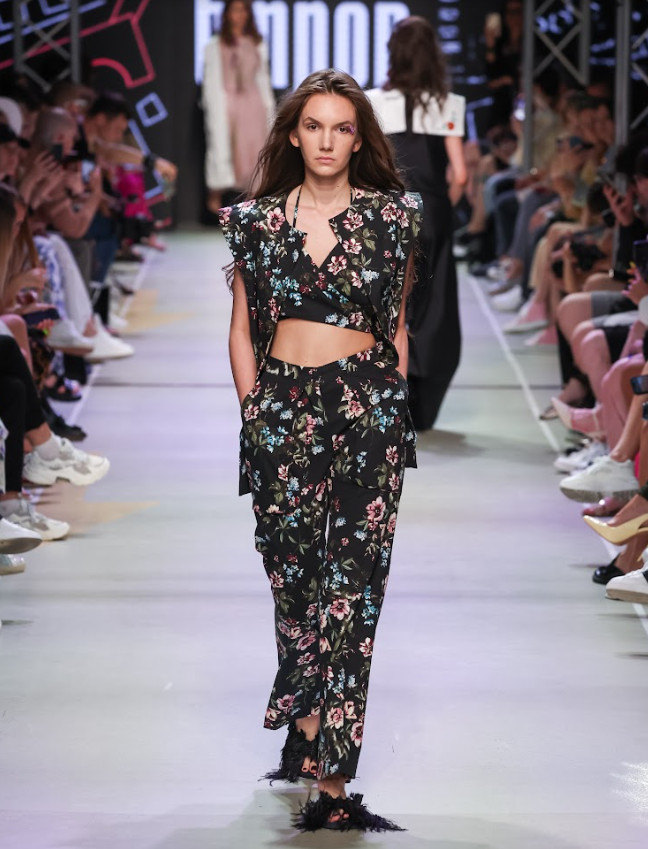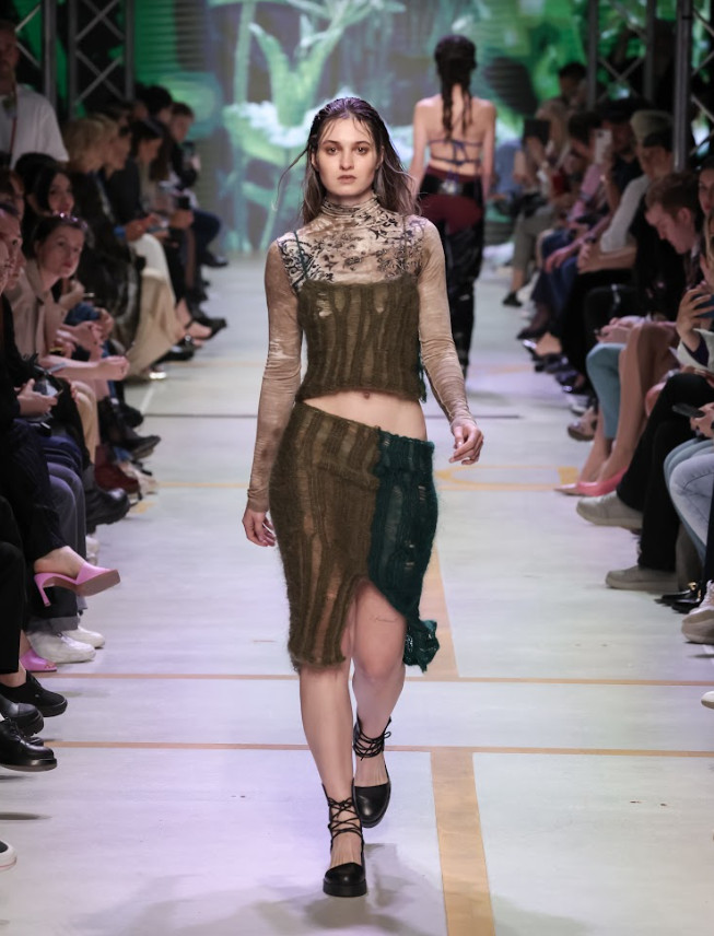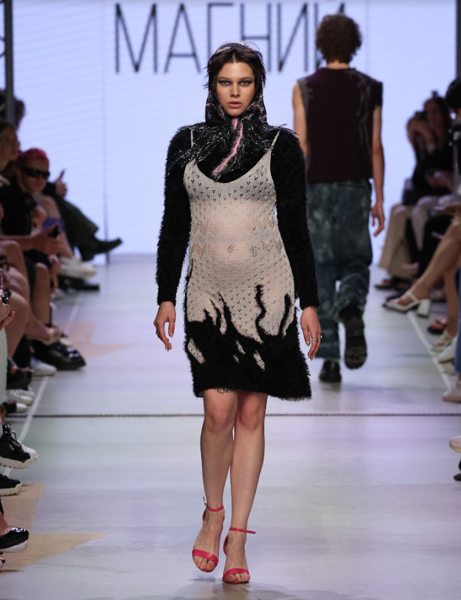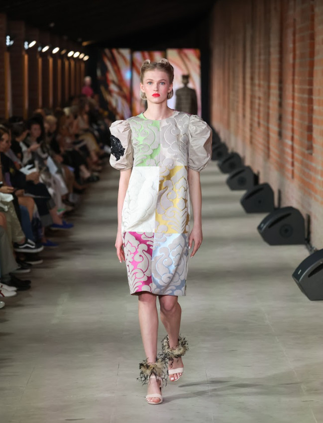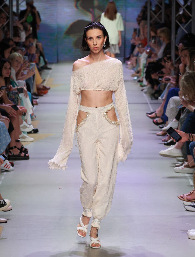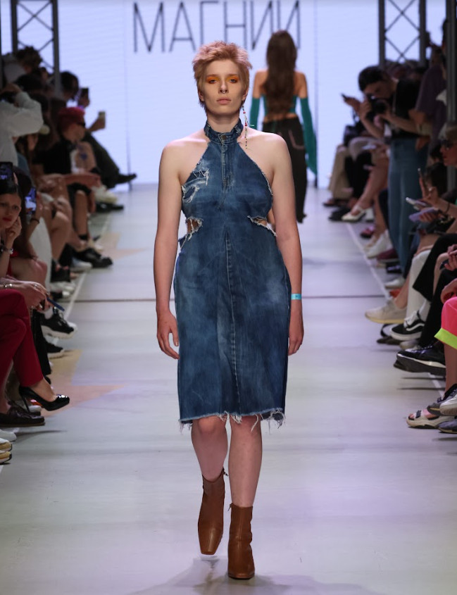 Emerging designer Dima Shapovalov presented the debut collection of his Dima Magny brand – Experiment 1.0. The basic concept of the collection covered upcycling, sustainable fashion, and garment merging. Dresses with different textures in every piece, mini skirts with abstract patterns, sweatshirts merged with denim coats, rollover skirts, floral boleros, tops, and jackets with unsymmetrical sleeves – these were worn by the models walking down the catwalk. Some of the garments featured natural colors, but then the designer added some spice of red, blue, turquoise, and yellow. According to the designer, every piece has its energy value. It might be the answer to why the collection looks so dynamic and diverse.