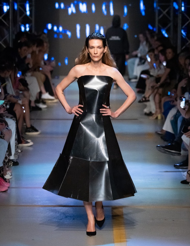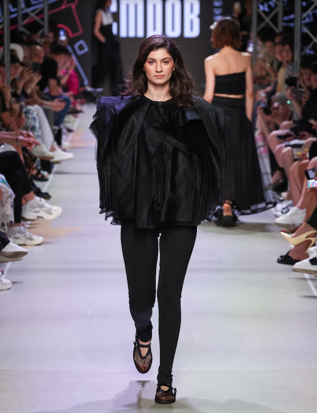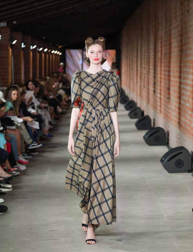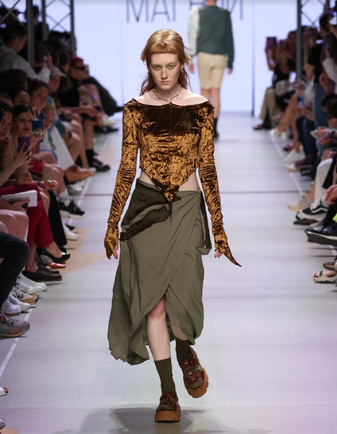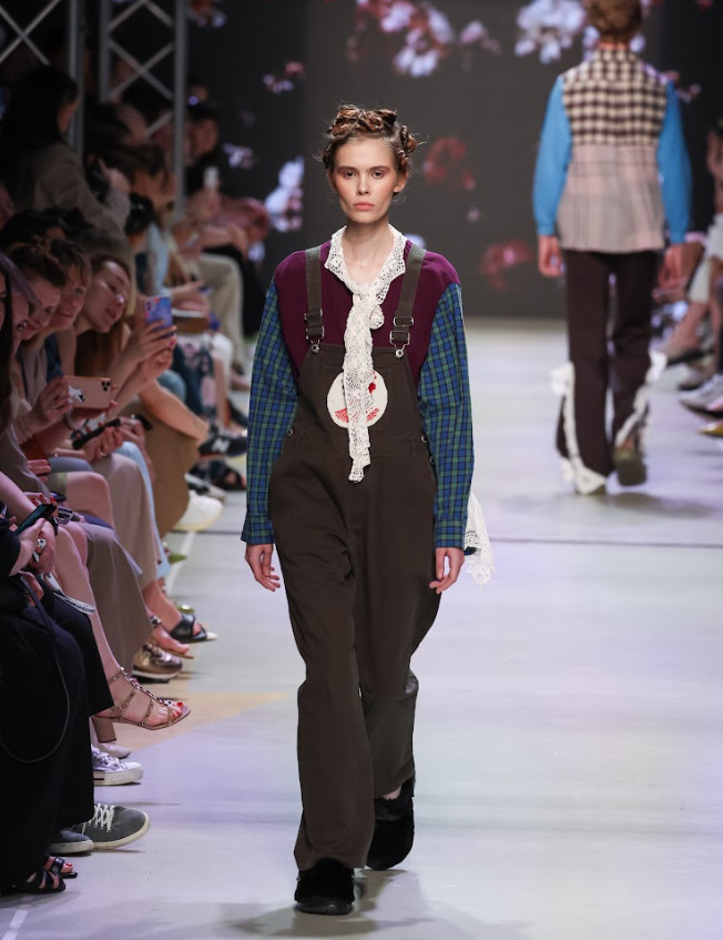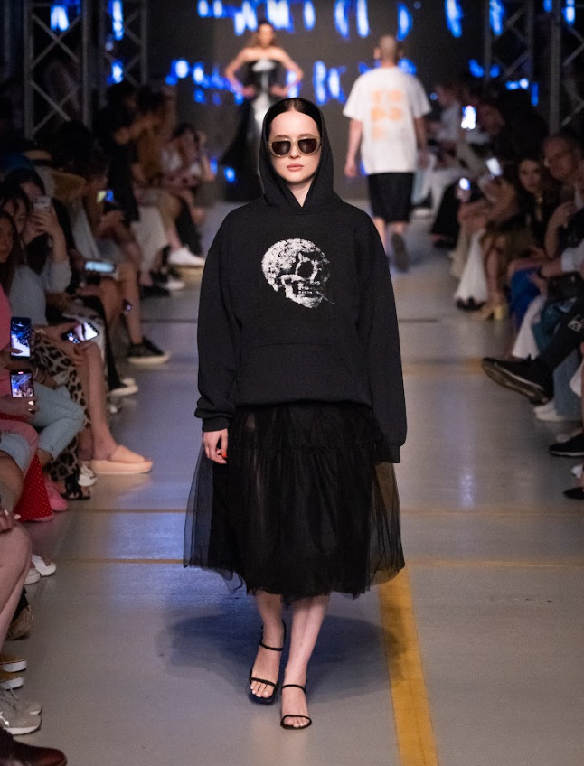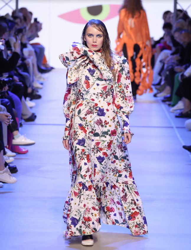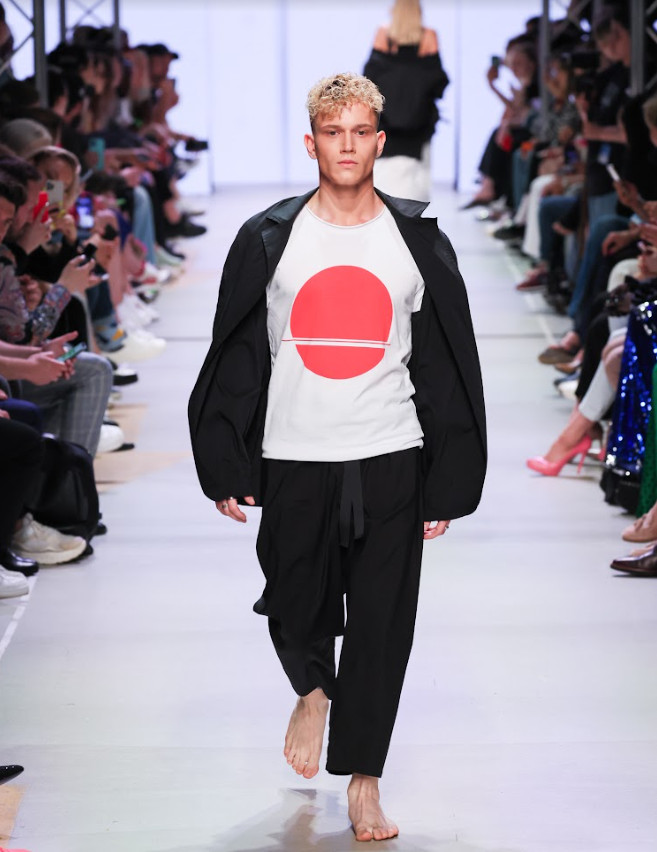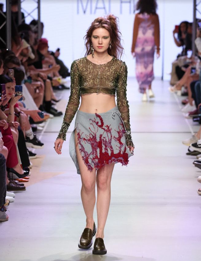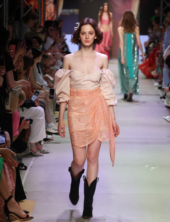 Emerging designer Dima Shapovalov presented the debut collection of his Dima Magny brand – Experiment 1.0. The basic concept of the collection covered upcycling, sustainable fashion, and garment merging. Dresses with different textures in every piece, mini skirts with abstract patterns, sweatshirts merged with denim coats, rollover skirts, floral boleros, tops, and jackets with unsymmetrical sleeves – these were worn by the models walking down the catwalk. Some of the garments featured natural colors, but then the designer added some spice of red, blue, turquoise, and yellow. According to the designer, every piece has its energy value. It might be the answer to why the collection looks so dynamic and diverse.