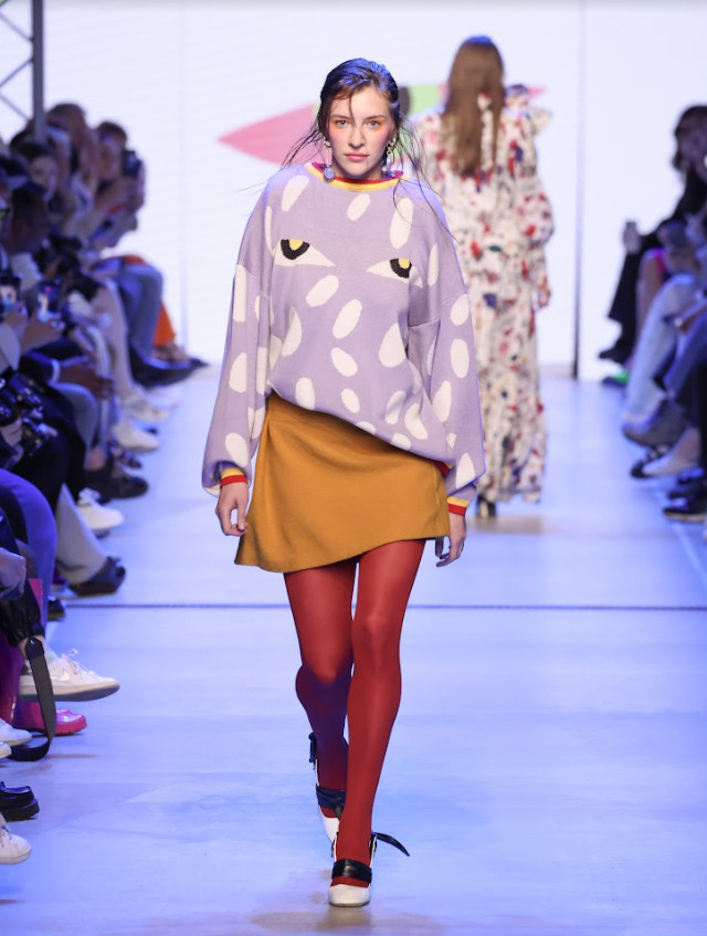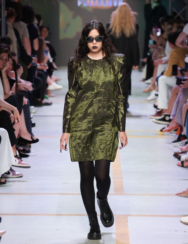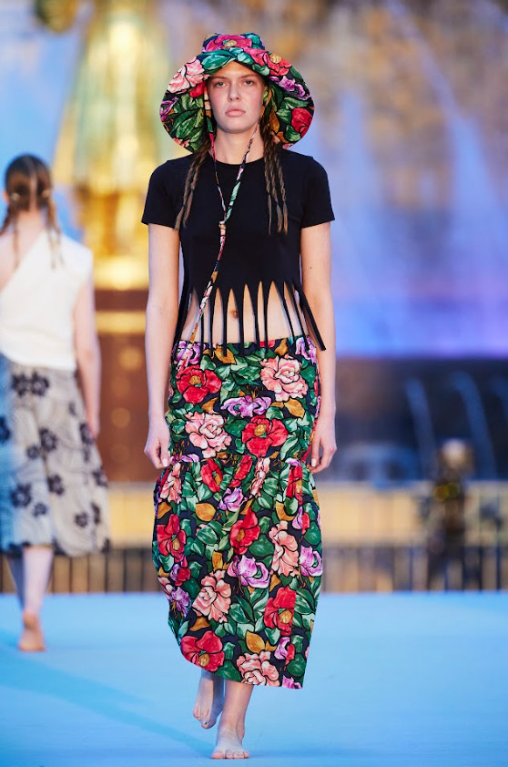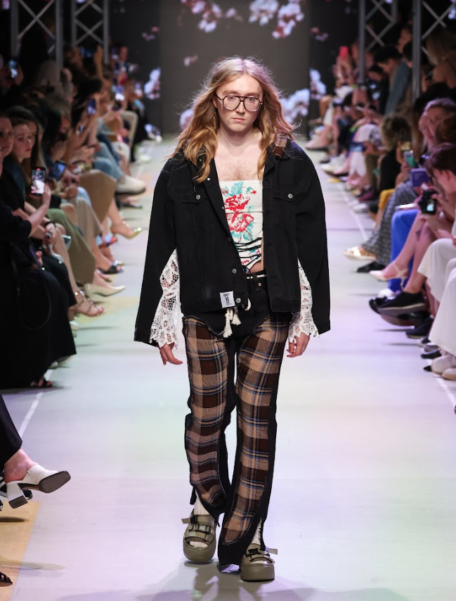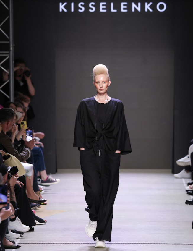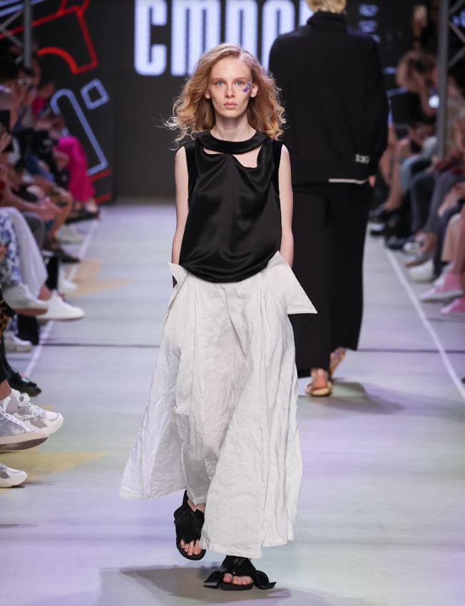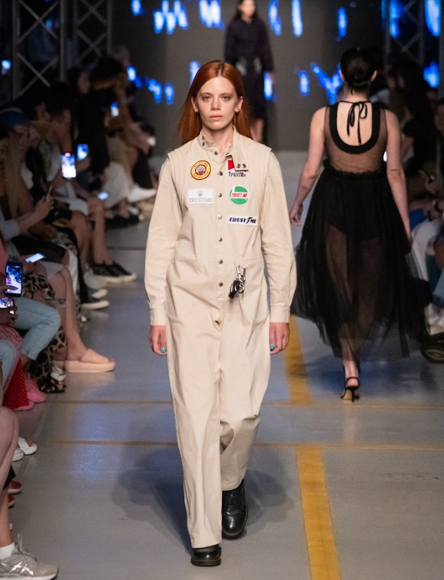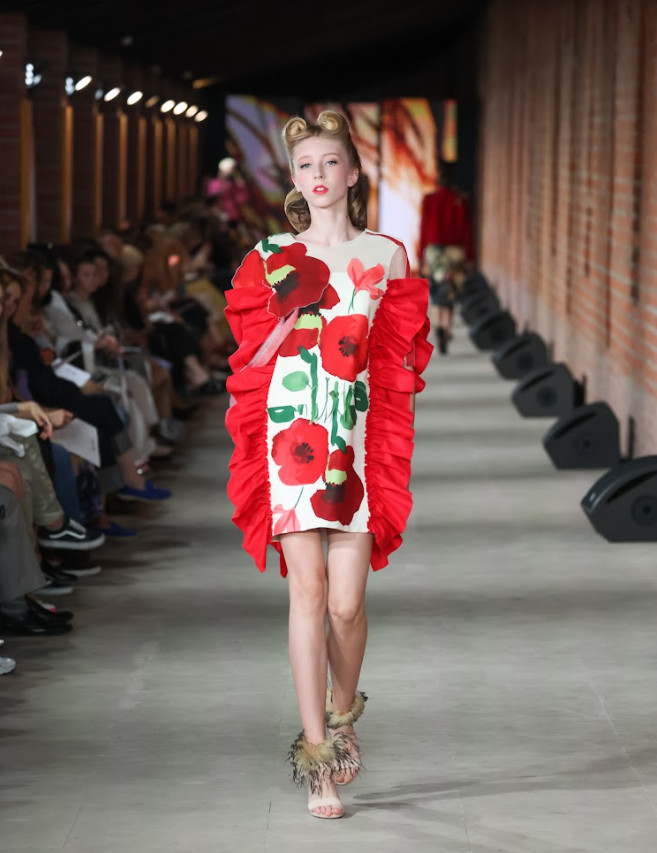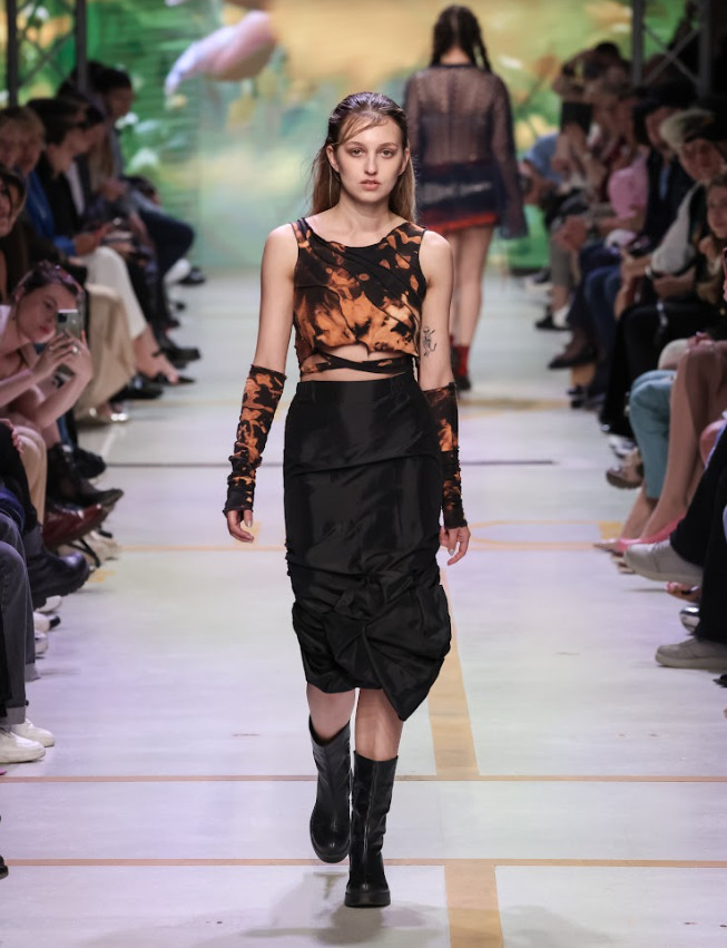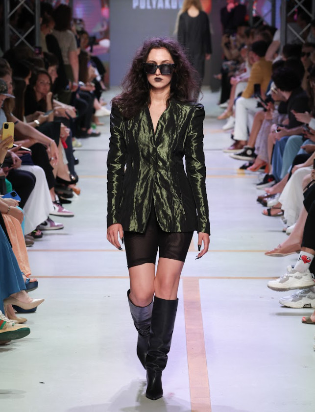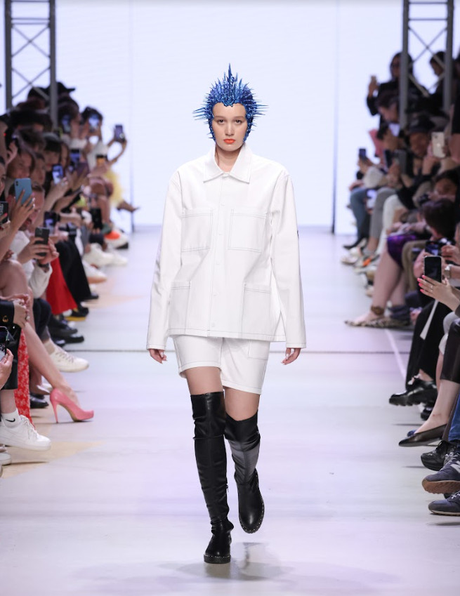 Emerging designer Dima Shapovalov presented the debut collection of his Dima Magny brand – Experiment 1.0. The basic concept of the collection covered upcycling, sustainable fashion, and garment merging. Dresses with different textures in every piece, mini skirts with abstract patterns, sweatshirts merged with denim coats, rollover skirts, floral boleros, tops, and jackets with unsymmetrical sleeves – these were worn by the models walking down the catwalk. Some of the garments featured natural colors, but then the designer added some spice of red, blue, turquoise, and yellow. According to the designer, every piece has its energy value. It might be the answer to why the collection looks so dynamic and diverse.