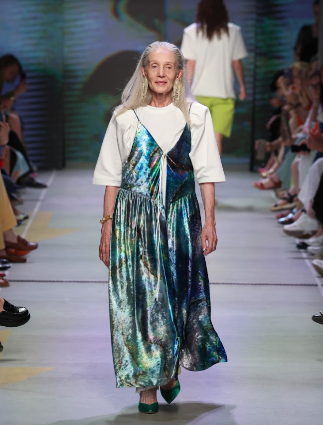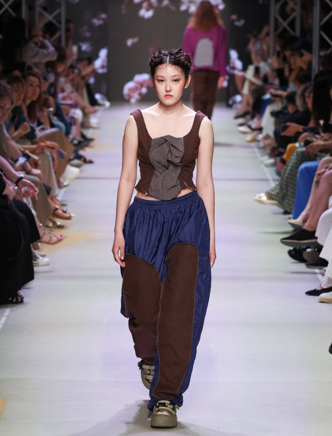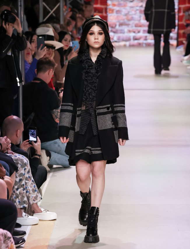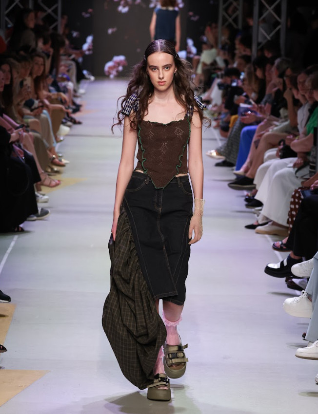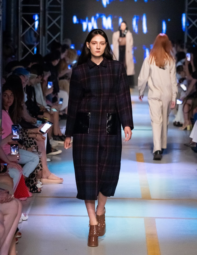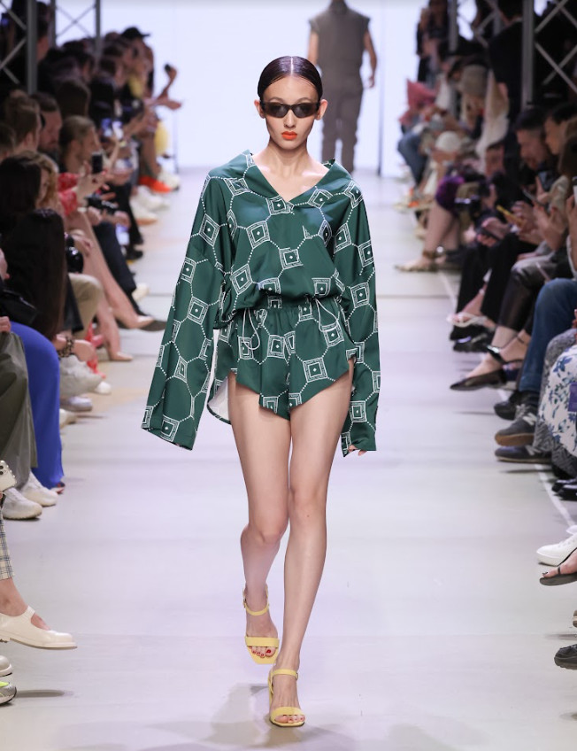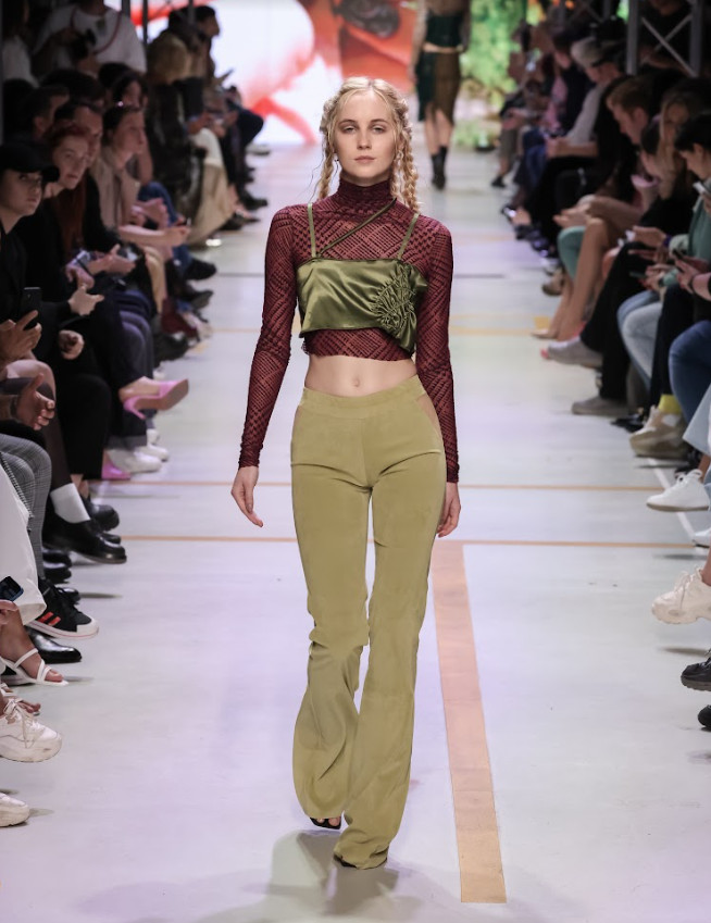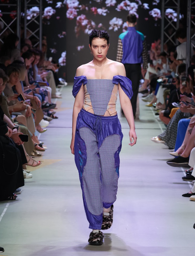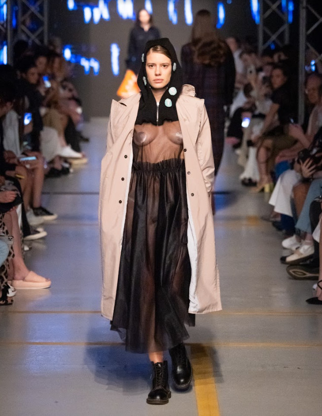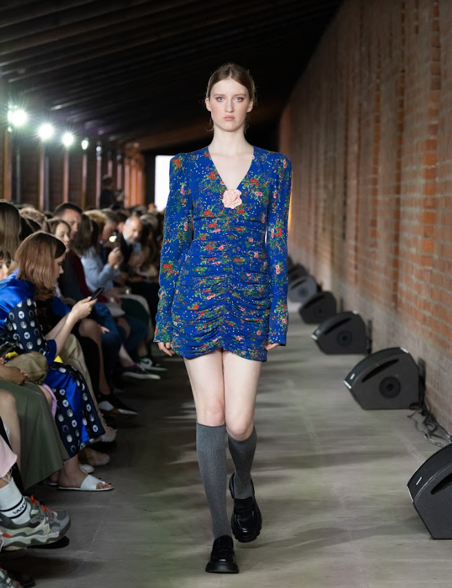 Emerging designer Dima Shapovalov presented the debut collection of his Dima Magny brand – Experiment 1.0. The basic concept of the collection covered upcycling, sustainable fashion, and garment merging. Dresses with different textures in every piece, mini skirts with abstract patterns, sweatshirts merged with denim coats, rollover skirts, floral boleros, tops, and jackets with unsymmetrical sleeves – these were worn by the models walking down the catwalk. Some of the garments featured natural colors, but then the designer added some spice of red, blue, turquoise, and yellow. According to the designer, every piece has its energy value. It might be the answer to why the collection looks so dynamic and diverse.