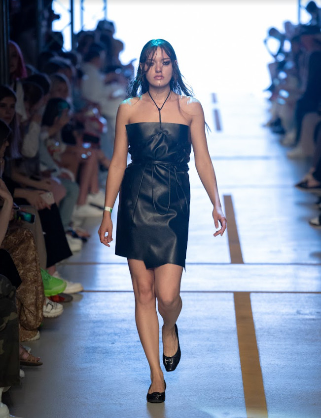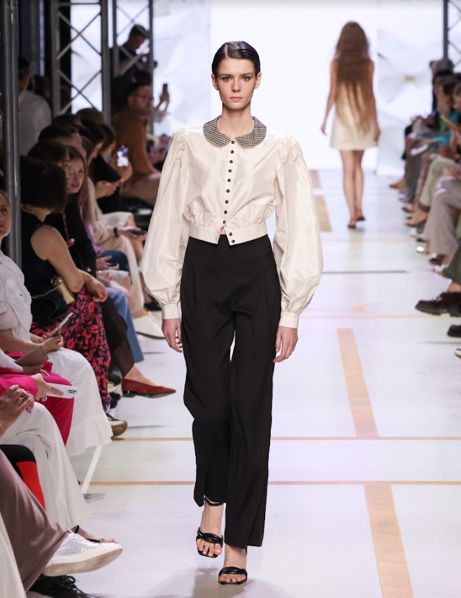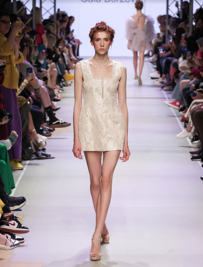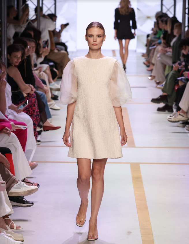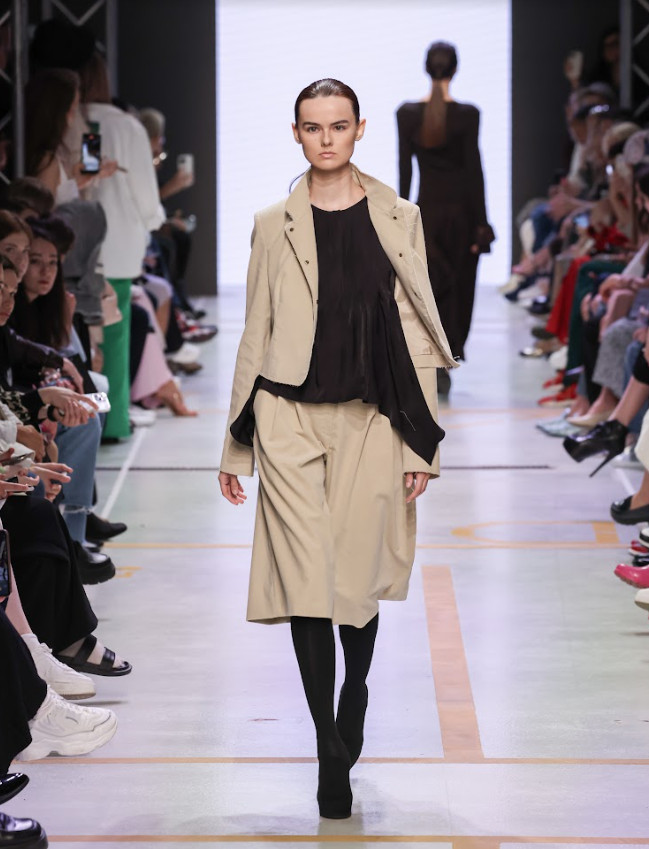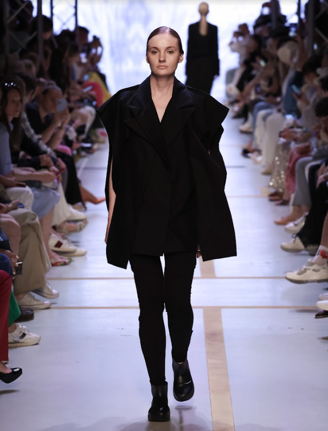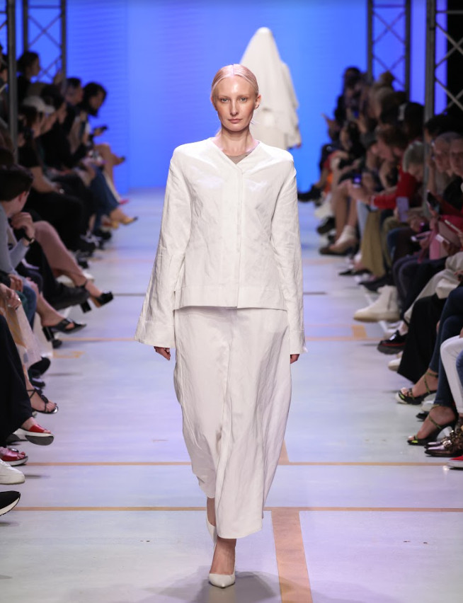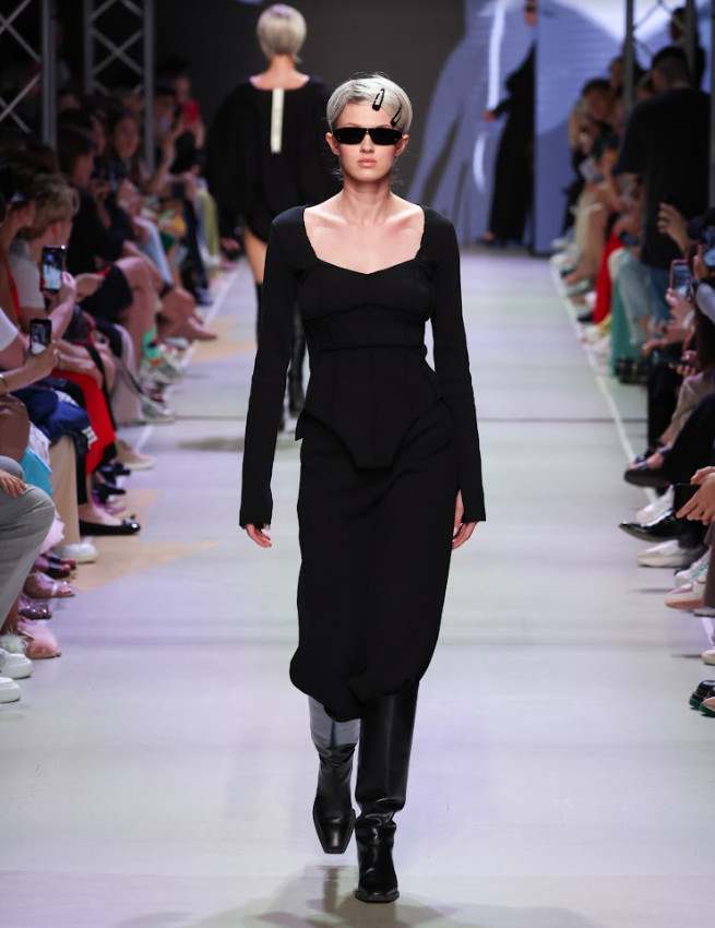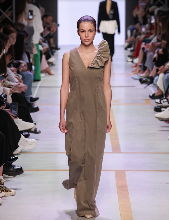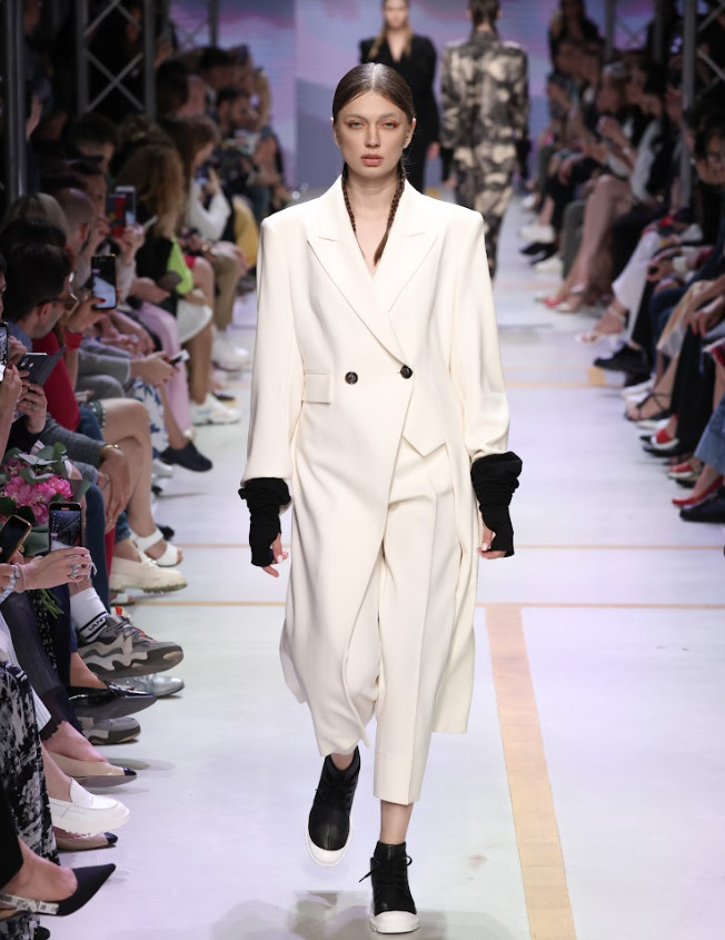 This emerging brand follows the sustainability vector. They use only natural stuff and recycled package to make clothes. At the show, the brand presented pieces from two collections at once – Convoité and Éclat de beauté. Basic colors were white, black, and light beige. Corsets, puffed sleeves, and zephyrous skirts of translucid silk organza ensured the overall romantic spirit of the collection. Besides childish tops and dresses, LUBOVI also brought basic tops and shorts of texturized recycled cotton, a minimalist A-cut dress, and laconic lapel-free jackets.