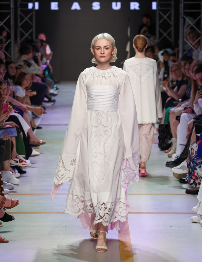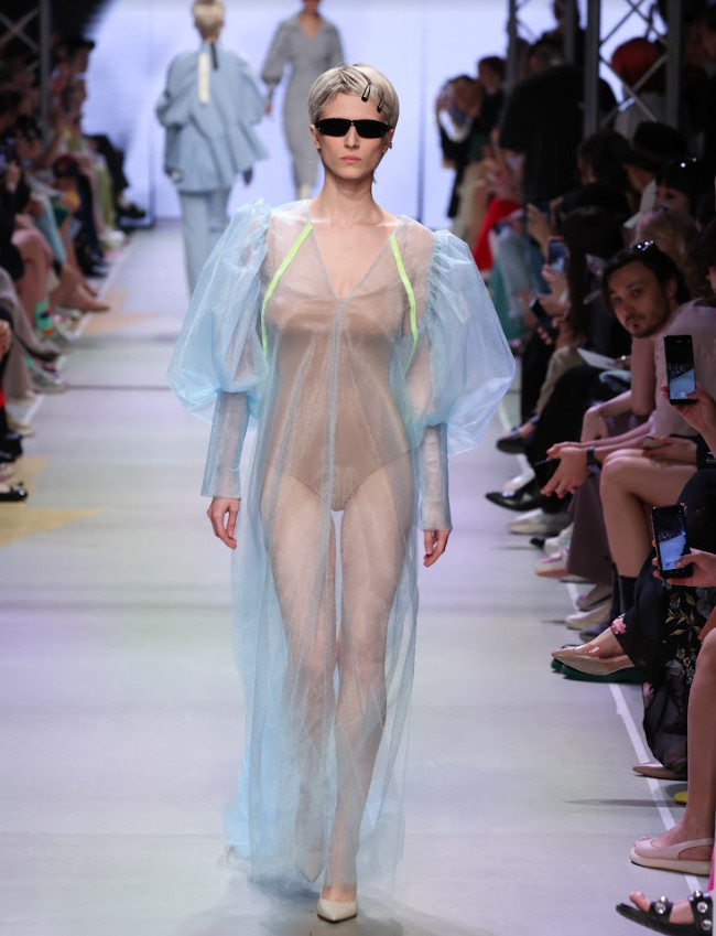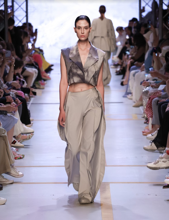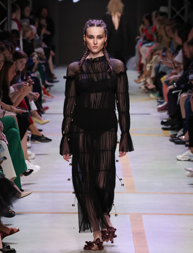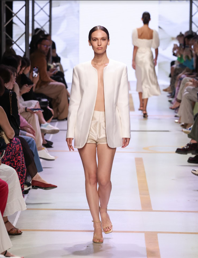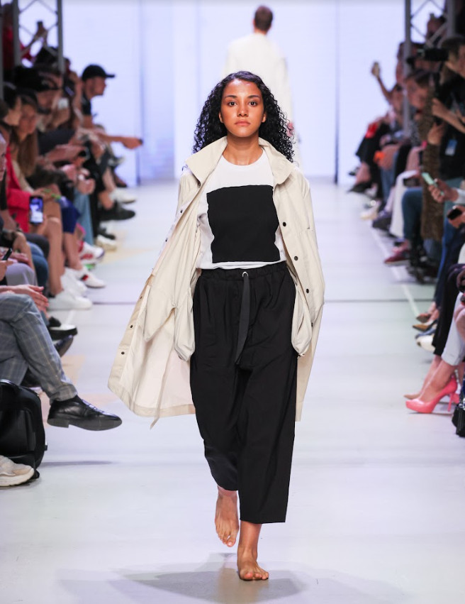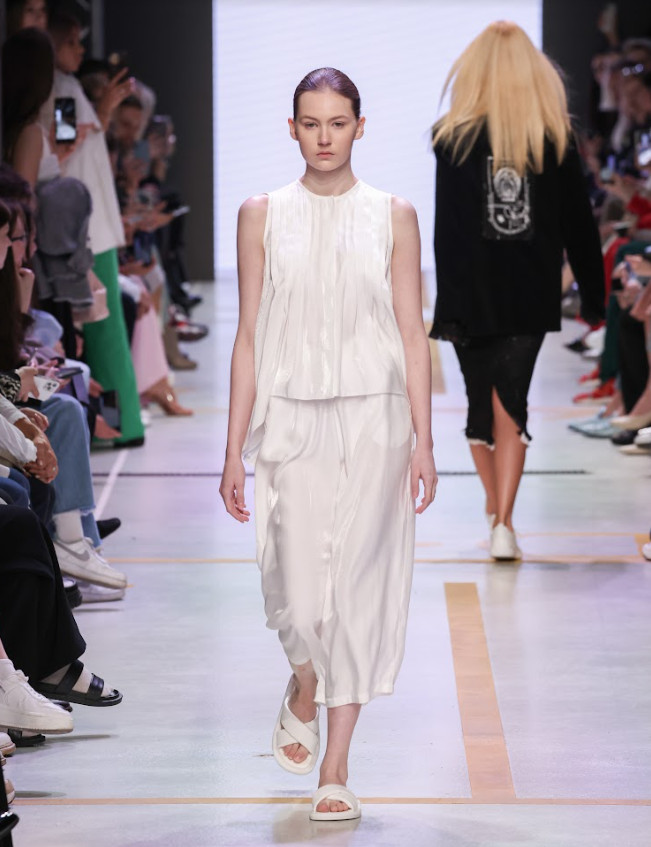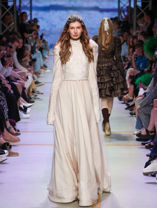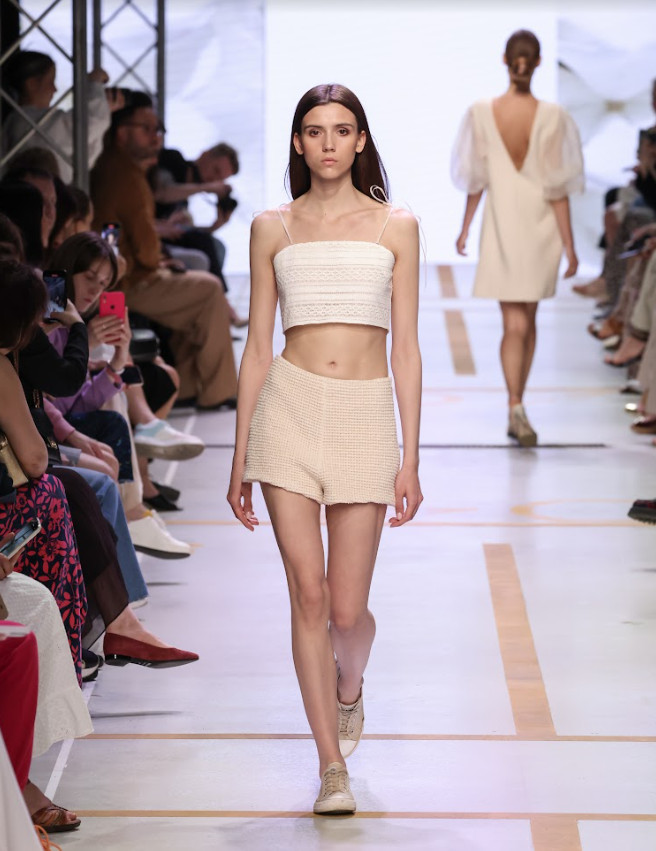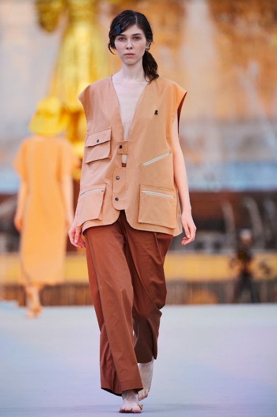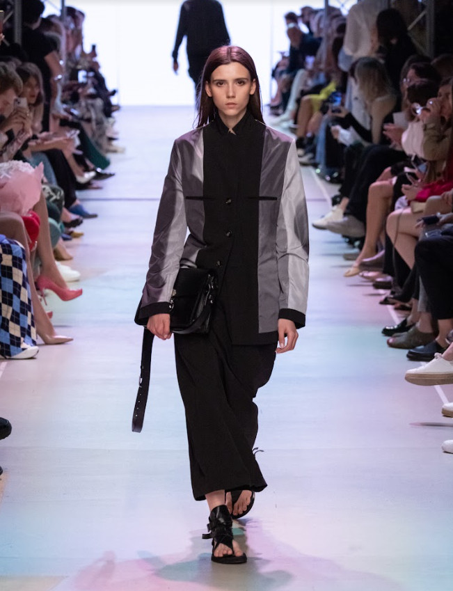 This emerging brand follows the sustainability vector. They use only natural stuff and recycled package to make clothes. At the show, the brand presented pieces from two collections at once – Convoité and Éclat de beauté. Basic colors were white, black, and light beige. Corsets, puffed sleeves, and zephyrous skirts of translucid silk organza ensured the overall romantic spirit of the collection. Besides childish tops and dresses, LUBOVI also brought basic tops and shorts of texturized recycled cotton, a minimalist A-cut dress, and laconic lapel-free jackets.
