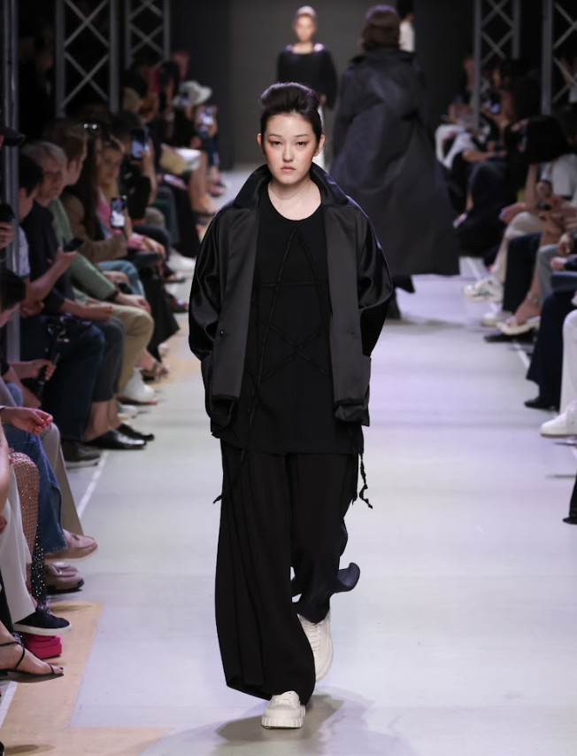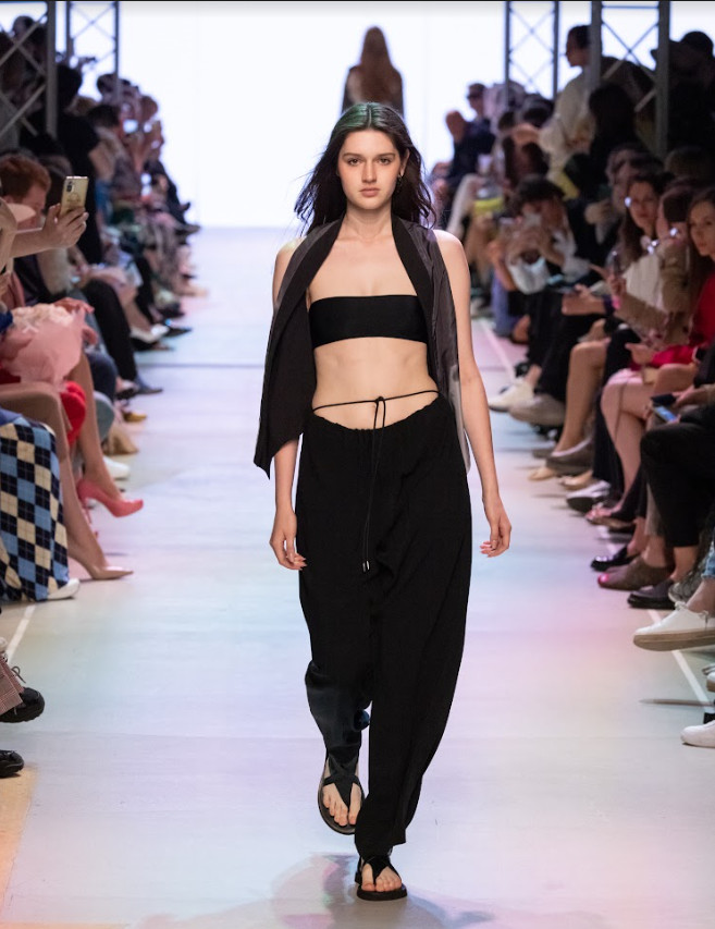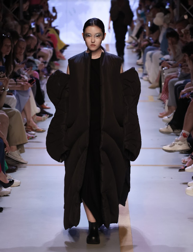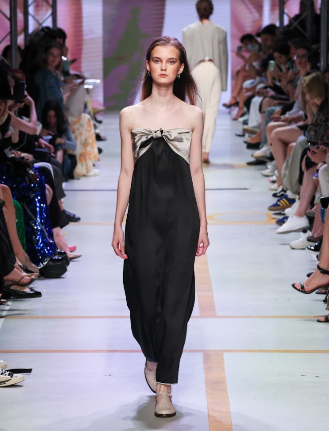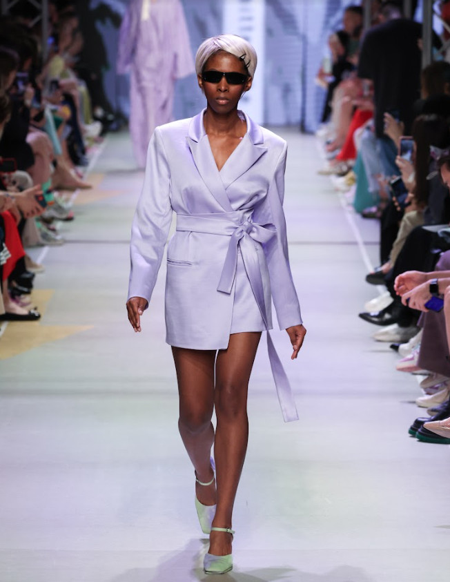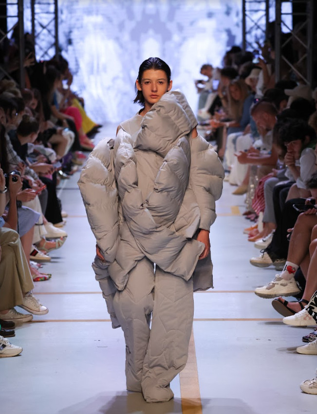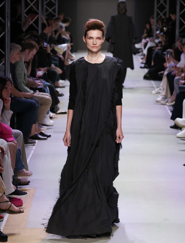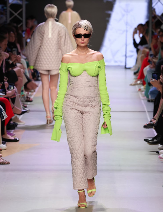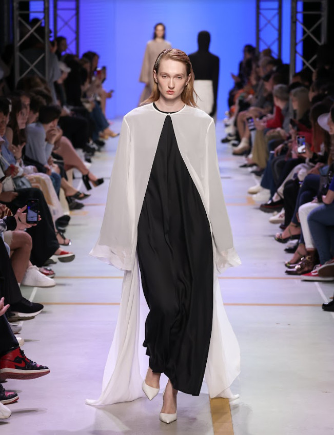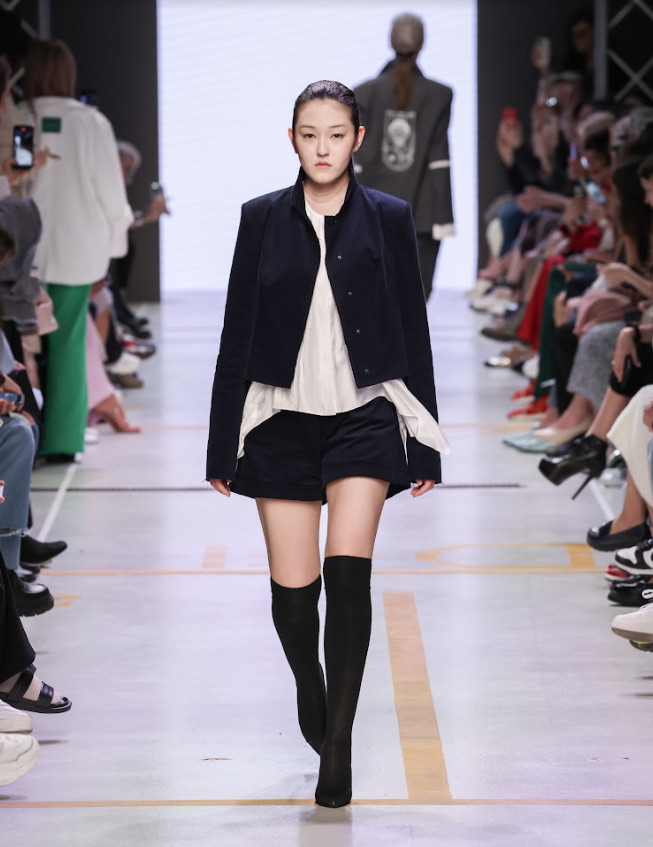 This emerging brand follows the sustainability vector. They use only natural stuff and recycled package to make clothes. At the show, the brand presented pieces from two collections at once – Convoité and Éclat de beauté. Basic colors were white, black, and light beige. Corsets, puffed sleeves, and zephyrous skirts of translucid silk organza ensured the overall romantic spirit of the collection. Besides childish tops and dresses, LUBOVI also brought basic tops and shorts of texturized recycled cotton, a minimalist A-cut dress, and laconic lapel-free jackets.