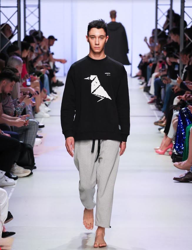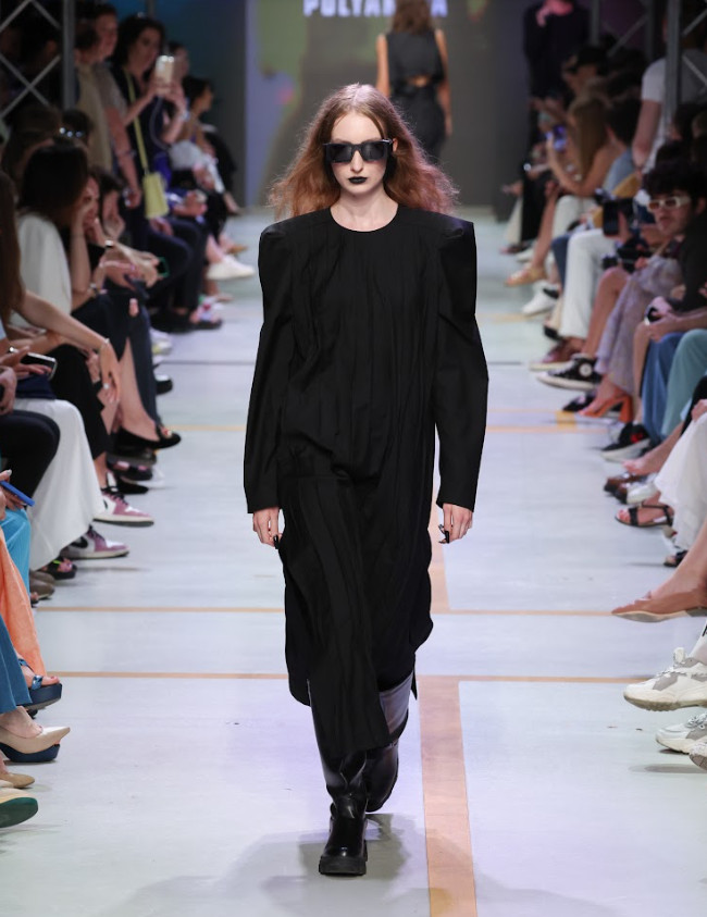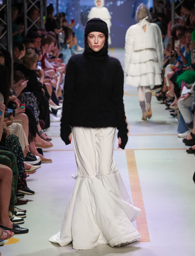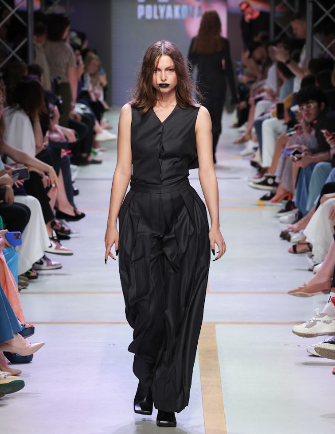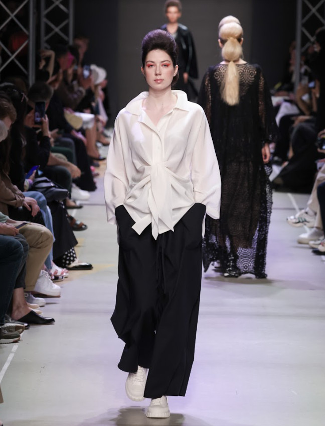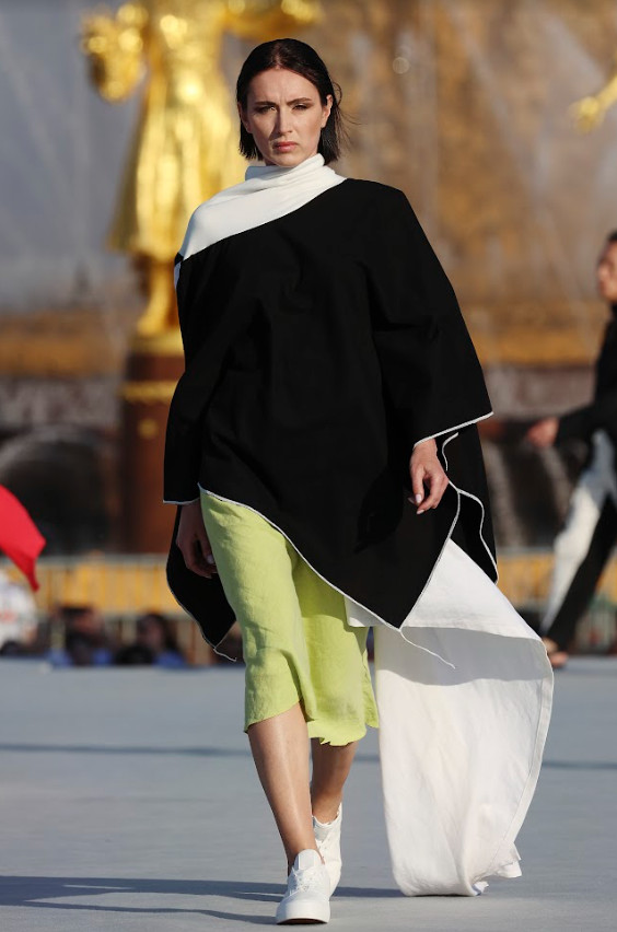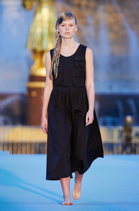 Elena Mezhova, the brand designer, had a go at showing a person’s wish to be closer to natural harmony. This was why she named every piece after a plant or an insect. Moscow Fashion Week goers were presented OSTREIDAE one-suiter, which repeated aesthetic features of an oyster, Hymenophore sportive suit, and Amanita dress with a skirt. Besides these remarkable pieces, the visitors were demonstrated free-cut shirts, unique T-shirts, and texturized pants, cropped tops with extra-long sleeves, suits with designer prints, underwear-like dresses, a straightly cut overcoat, and some oversize jackets. The most remarkable look was an extensive black dress with its hem made of waste bags. During a dancing performance, announced before the show started, this gown became an elegant one-piecer. 70% of the materials used to make this collection were recycled.