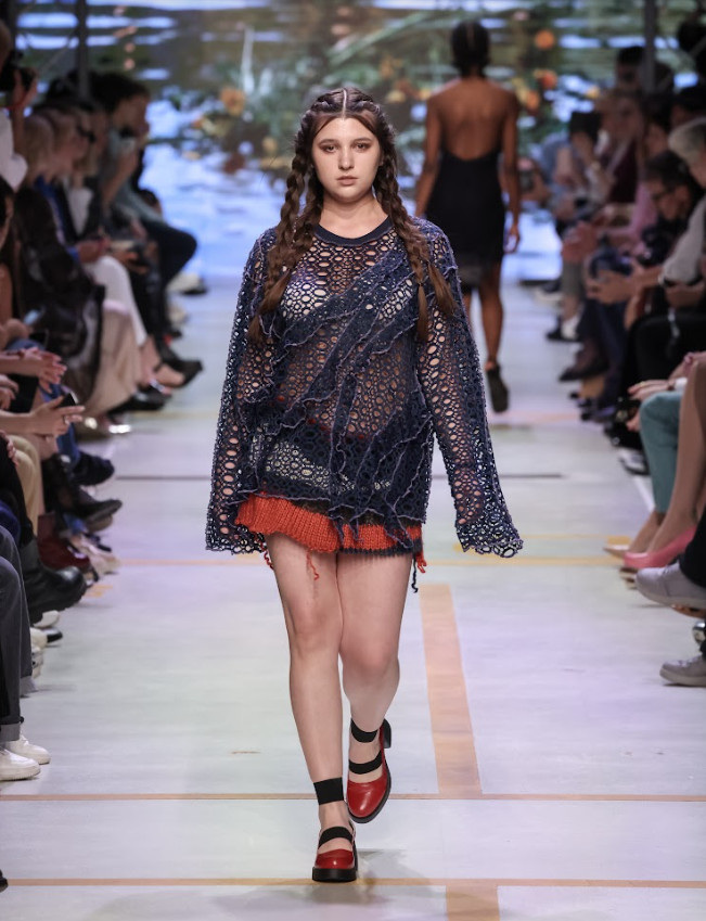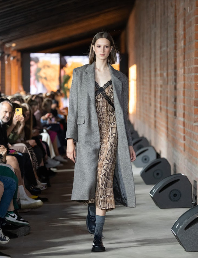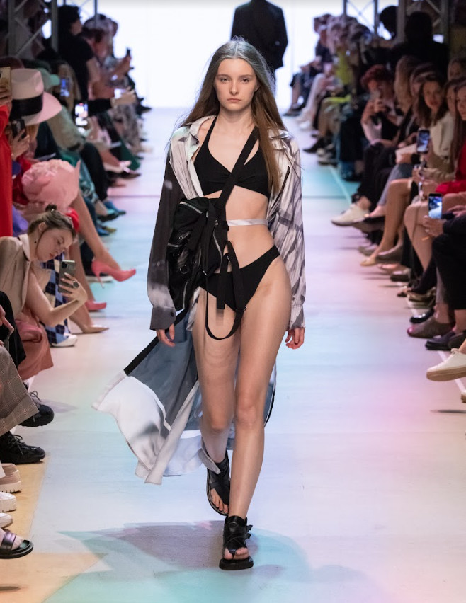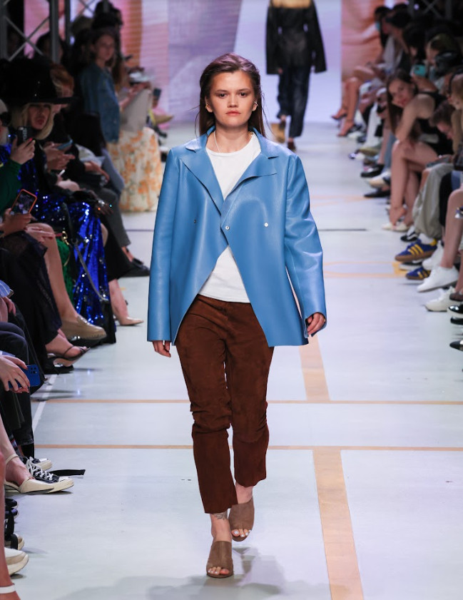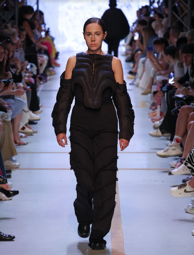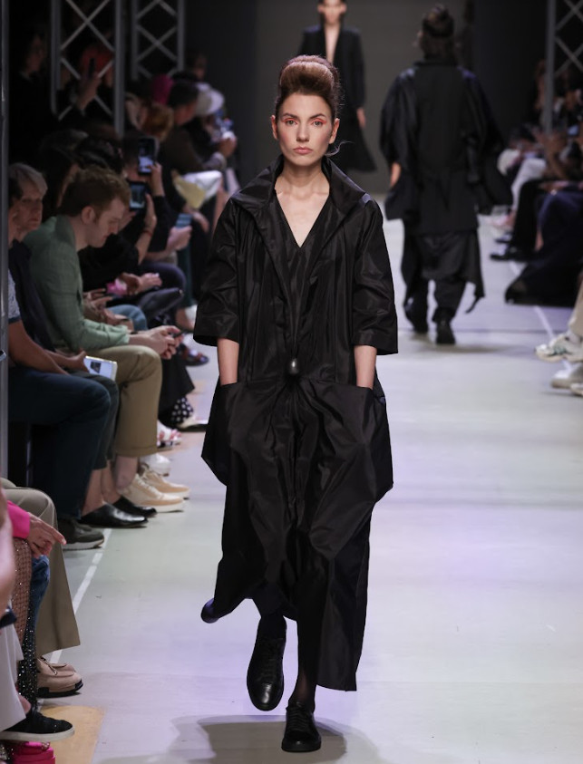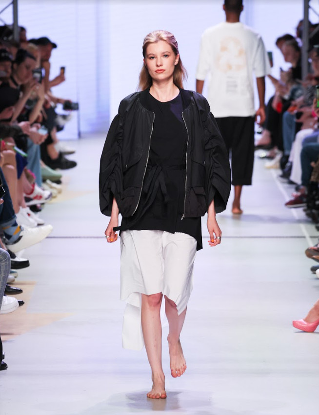 Elena Mezhova, the brand designer, had a go at showing a person’s wish to be closer to natural harmony. This was why she named every piece after a plant or an insect. Moscow Fashion Week goers were presented OSTREIDAE one-suiter, which repeated aesthetic features of an oyster, Hymenophore sportive suit, and Amanita dress with a skirt. Besides these remarkable pieces, the visitors were demonstrated free-cut shirts, unique T-shirts, and texturized pants, cropped tops with extra-long sleeves, suits with designer prints, underwear-like dresses, a straightly cut overcoat, and some oversize jackets. The most remarkable look was an extensive black dress with its hem made of waste bags. During a dancing performance, announced before the show started, this gown became an elegant one-piecer. 70% of the materials used to make this collection were recycled.