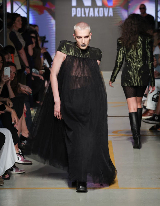 The show by ANNPOLYAKOVA, a Krasnoyarsk-based brand, closed the last day of Moscow Fashion Week. In her collection, the designer reconsidered Siberian historical codes and fused them with Avant-garde. The resulting garments were rich in architectural details, lots of layers, and abstract cuts. At the catwalk, the audience saw a true fashion show with posturing and a concept. Men joined the female models – although they also made appearance in women’s wear. Extensive dresses, tops, and skirts looked well on men, too. All the garments featured 4 colors – the prevailing black with vivid accents of gold, khaki, and electric blue. Semitransparent straight dresses, high-waste pants, overcoats as if borrowed from men, straight jackets of noble fabrics – the designer believes that piece on the collection would do to conquer the world. The bright highlight of the show was a vogue dance in a bright blue dress with golden inserts.