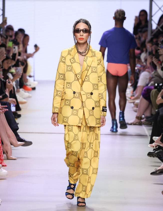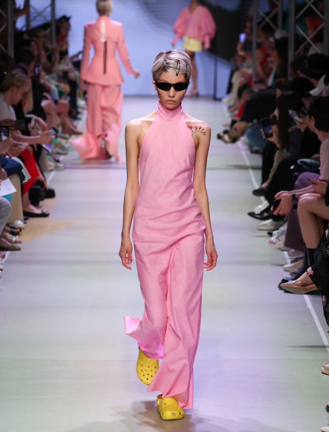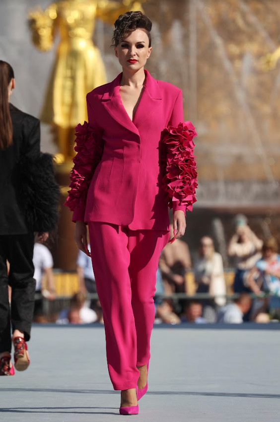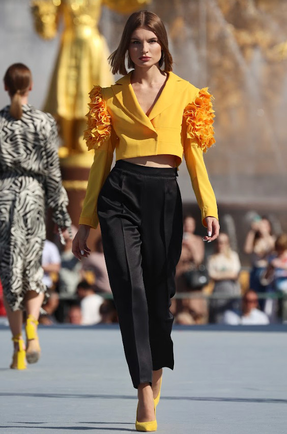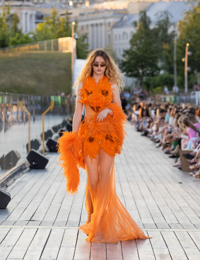 A whole universe in a single woman – the new collection by ESTER ABNER was dedicated to the symbol of life and love, which any girl is. The show was presented at the Floating Bridge in Zaryadye, and the main focus of the collection was on the game of contrasts and textures. Vivid hues of the collection – green, neon yellow, pink, peach pink, red, silvery, and blue – went so perfectly well with sequins under the rays of sun going down. Precise cuts, stability of shapes, and elegance – the collection followed the best traditions of the brand. At the catwalk, the show goers saw mini dresses, shiny evening garments, dresses with asymmetric hems and decollates, classic jackets with wide shorts and pants, and even some wedding looks. The list of accessories included extensive flowers and neckpieces, laconic chokers, as well as sunglasses. The show stopper was a model in electric orange semi-transparent dress decorated with feathers.