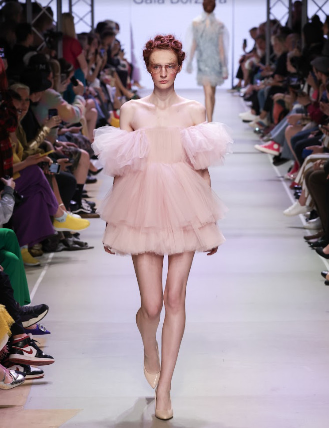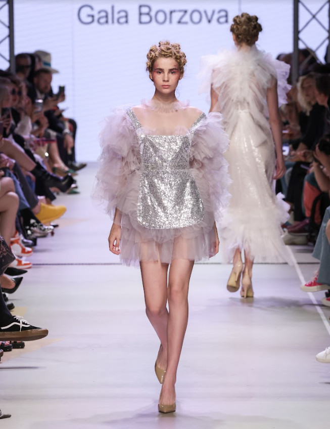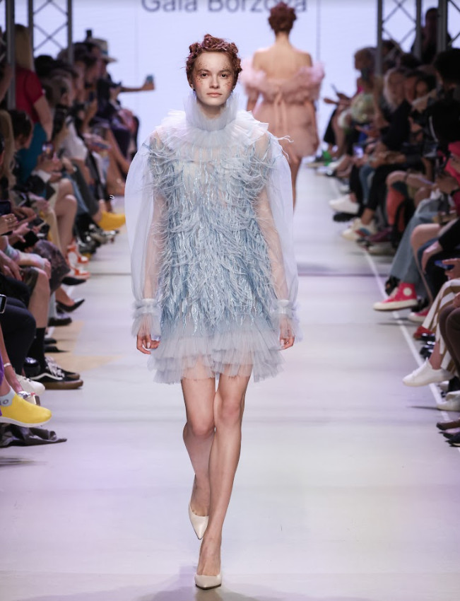The brand presented its Spring Summer 2023 collection designed in collaboration with stylist Gala Borzova. The alpha material of the new line is airy veiling, which was used to create gowns with tier-like and multilayer skirts, romantic blouses with rouches and extensive sleeves, as well as mantles with ruff collars. Tinsel, nets, marabou feathers, and other sophisticated materials made a suitable set with it. Besides midi party looks, the collection also featured cocktail jacket dresses, tops, and shorts. This is a story of friendship and collaboration between gifted designer Alyona and top stylist Gala. Light veiling and nets, complex textures, unconventional cuts, and tinsel – this is how the new collection by BÜRO UNIQUE X Gala Borzova can be described in short. Crazy Couture – this is what it is.
