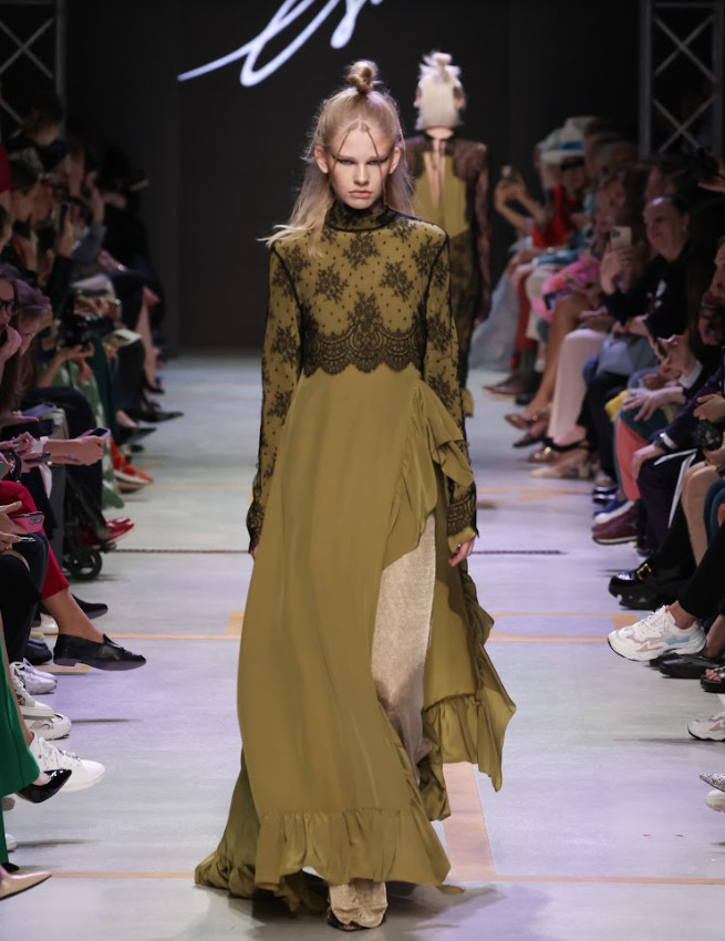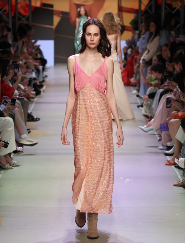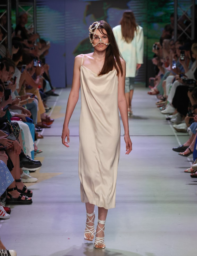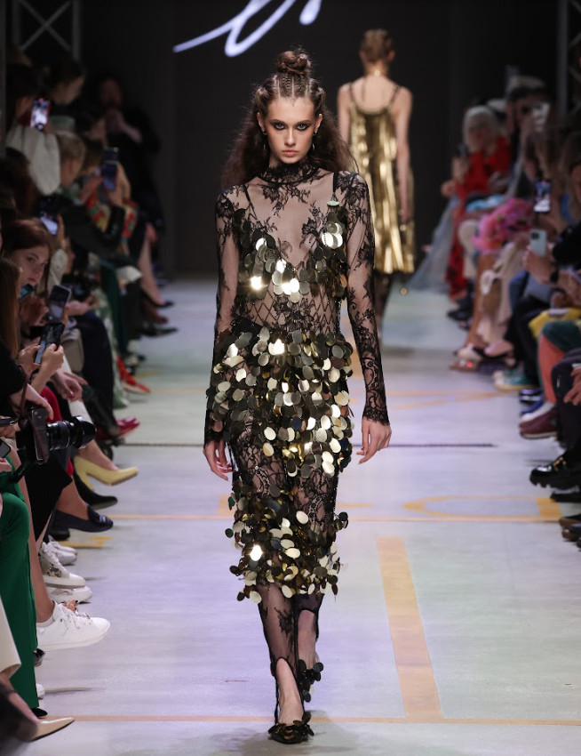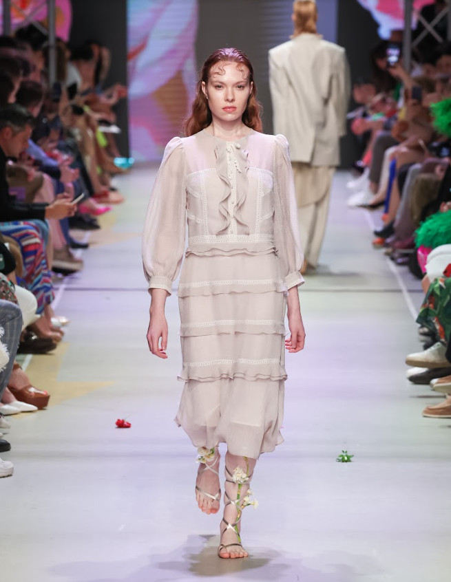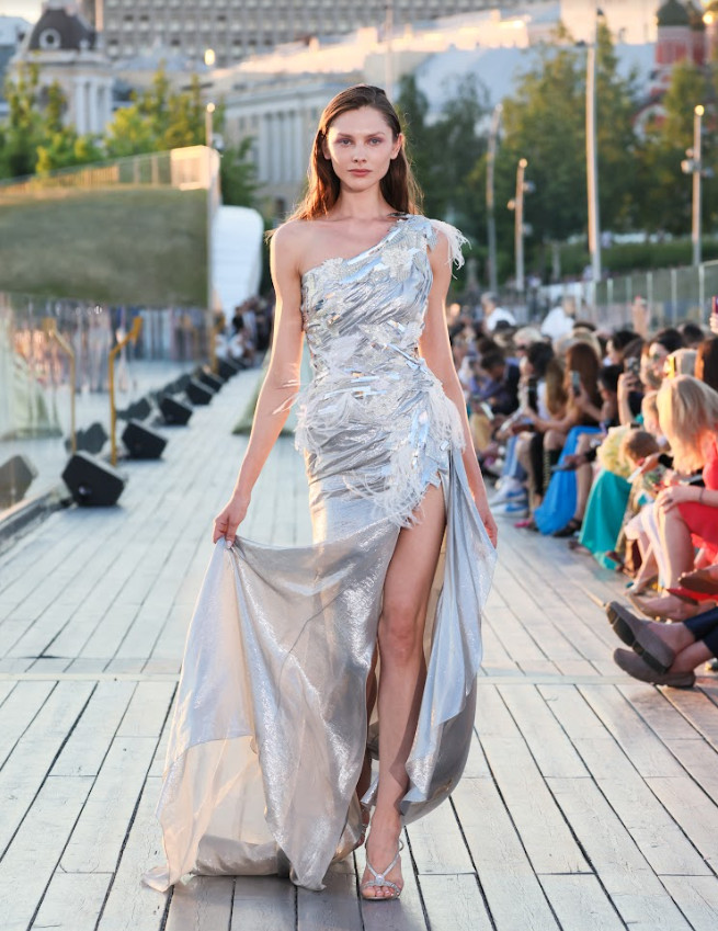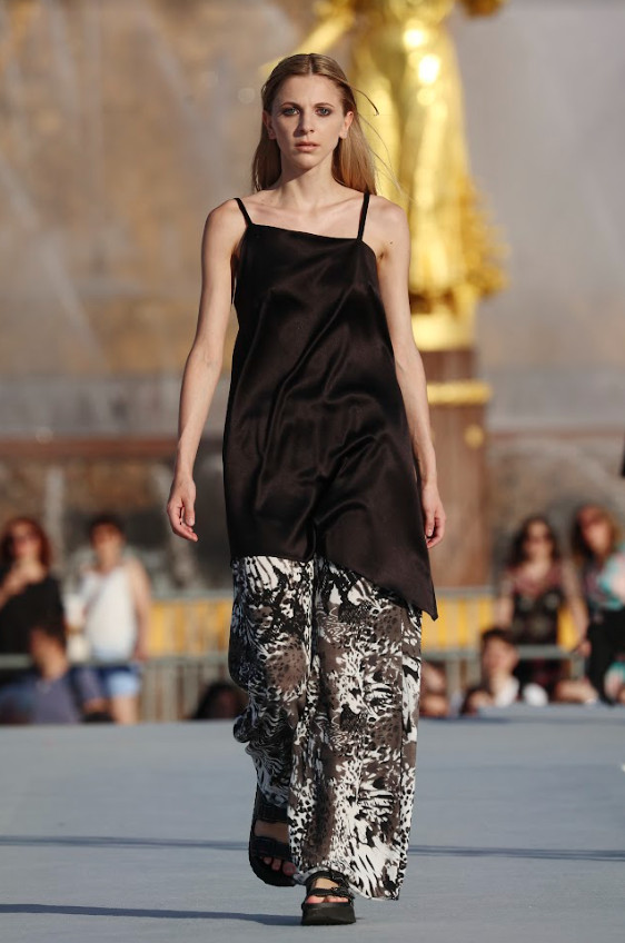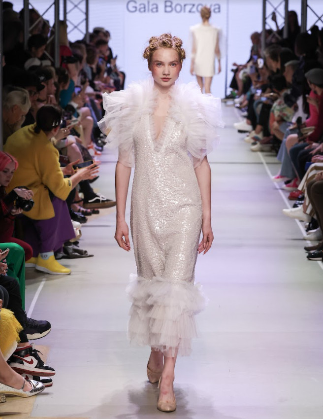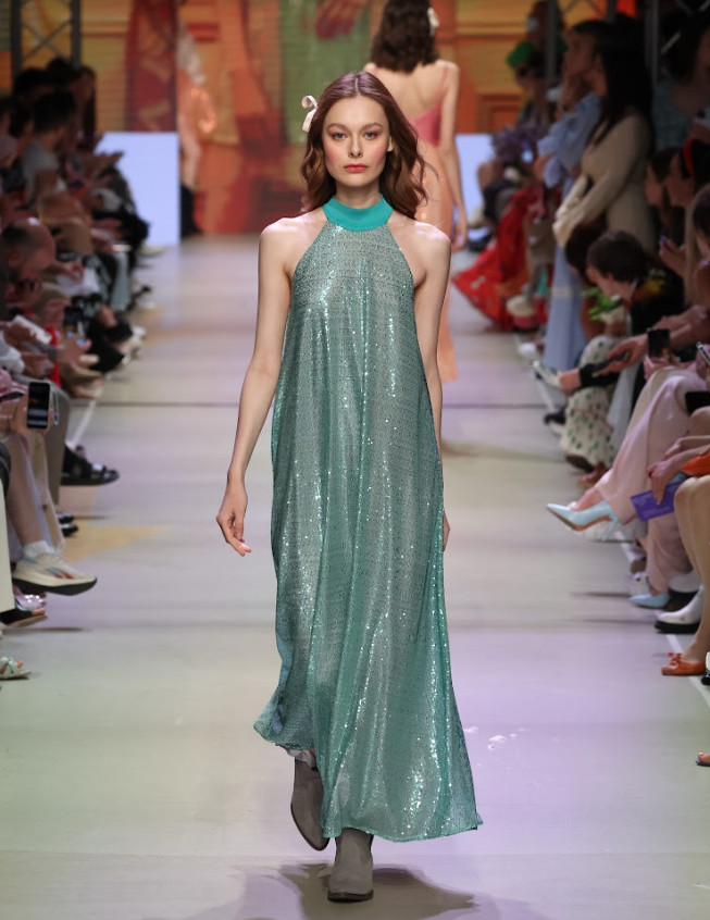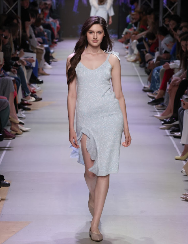 Designer Evgeniya Linovich states that there is always a reason to dress up, and she creates garments for special occasions. The show started with acapella performance of the Comets song (polnalyubvi) and continued with a smooth dancing sketch. Basically, the collection featured feminine dresses accentuating body contours, all of them light white, beige, menthol green, and pink. Sequins set up the mood, and the looks seemed perfect for any occasion. Satin, lace, flowing and airy fabrics were chosen to highlight elegance, shine, and easiness.