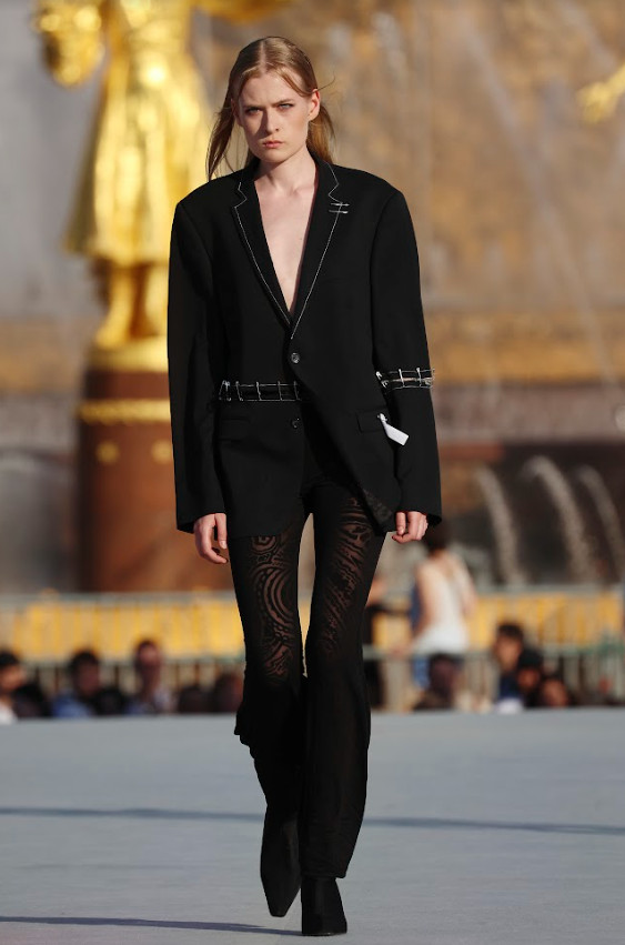 As usual, a St. Petersburg based designer Ianis Chamalidy brought a collection that was mainly black. Clothes are designed for real people, but not without a hint of Avant-garde – this is what one might say about the new DIVIDUUM collection, both austere and graphic. Both men’s and women’s looks were demonstrated at the catwalk. Womenswear included volant maxi dresses, wide trousers and shorts accompanied by translucid bras, trousers suits, extended jackets, and classic overcoats. Menswear comprised plain two-piece suits accompanied by semi-transparent shirts; suit coats decorated with fine chain strings; wide shorts; and irregularly cut tank tops.