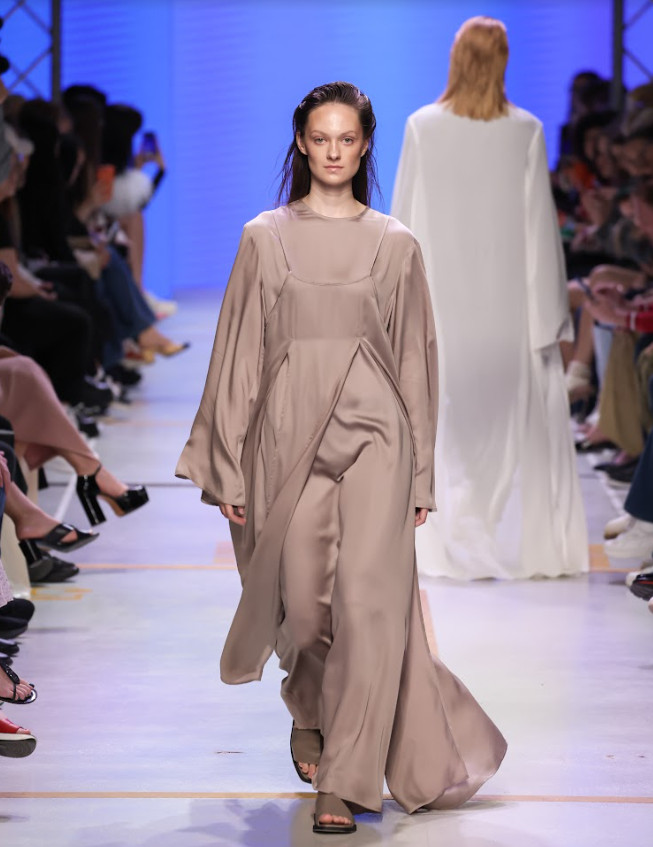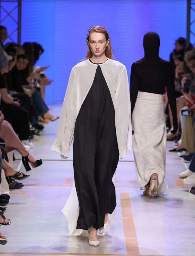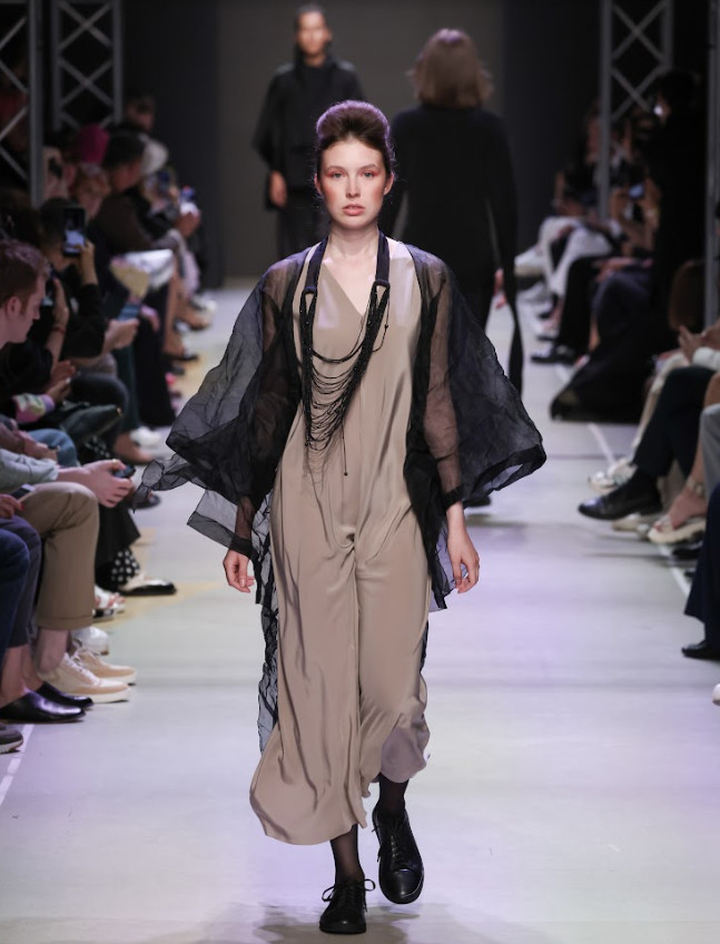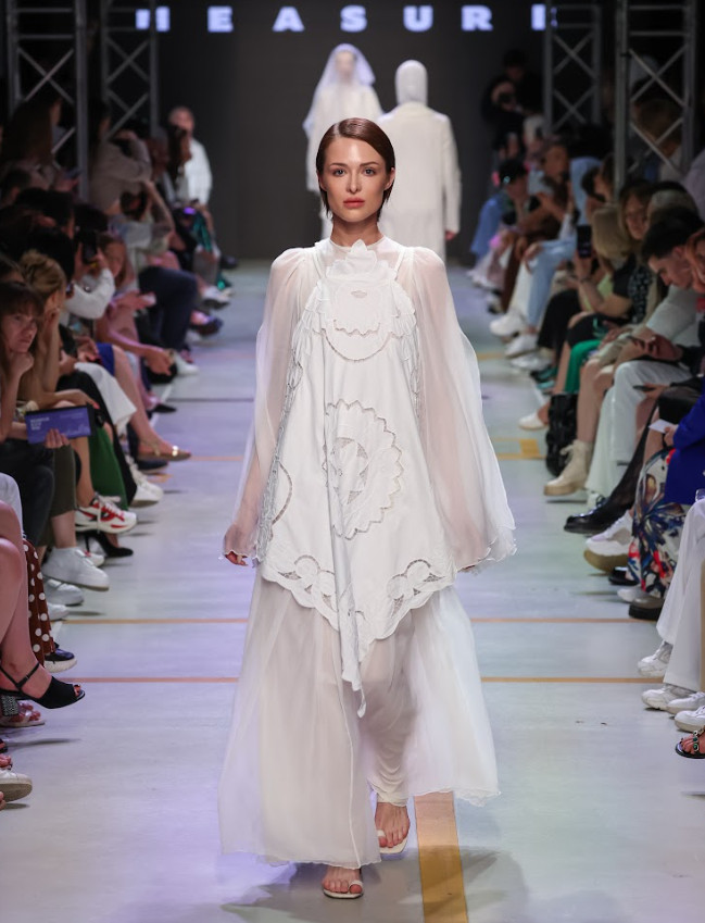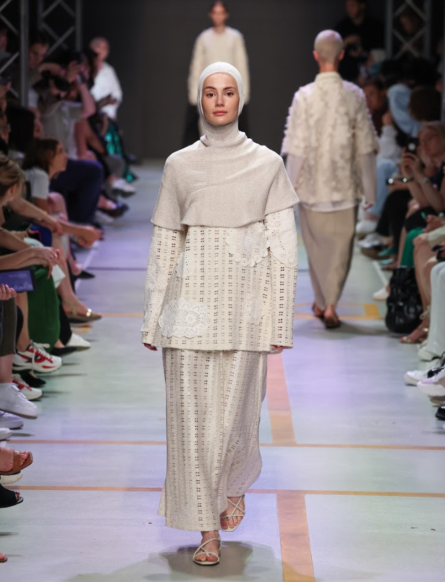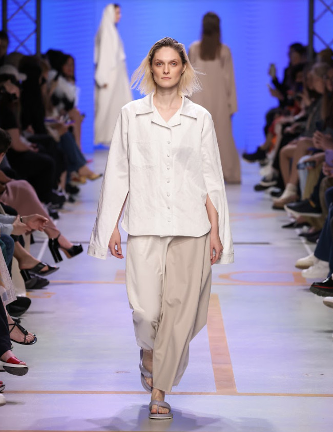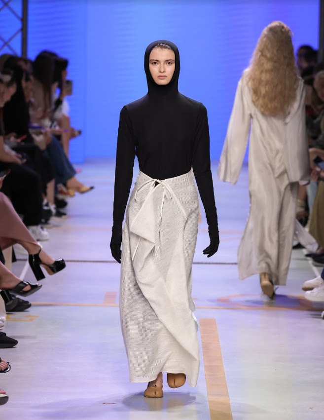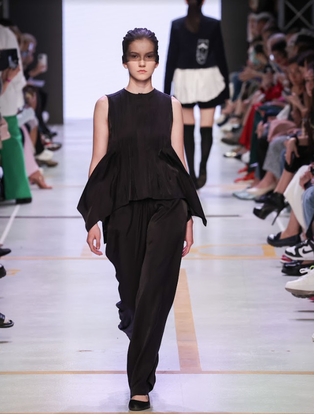 This emerging brand led by designer Zuhat Asekova adheres to modest fashion guidelines. The designer makes garments that cover the bodies all over but for hands and facial contours. At the same time, many models feature functional and well-considered solutions that can be used as independent combinations and long-sleeve dresses. This season, the collection was a new take on the cultural heritage – it seemed to refer to Vietnamese high slit tunics, Japanese kimonos, and Caucasian traditional garments that inherit Asian motives thanks to geographical proximity. Deconstruction-like elements combined with traditional keynotes was the designer’s meditation about contemporaneity and old times connected. Pinafore dresses with fine shoulder straps were presented worn over dresses, skirts were cut from altered pants, blouses and so many more elements featured silk organza. The choice of monochrome hues, metallic gloss, laconic elements like stripes or bows emphasized that modesty can be attractive.