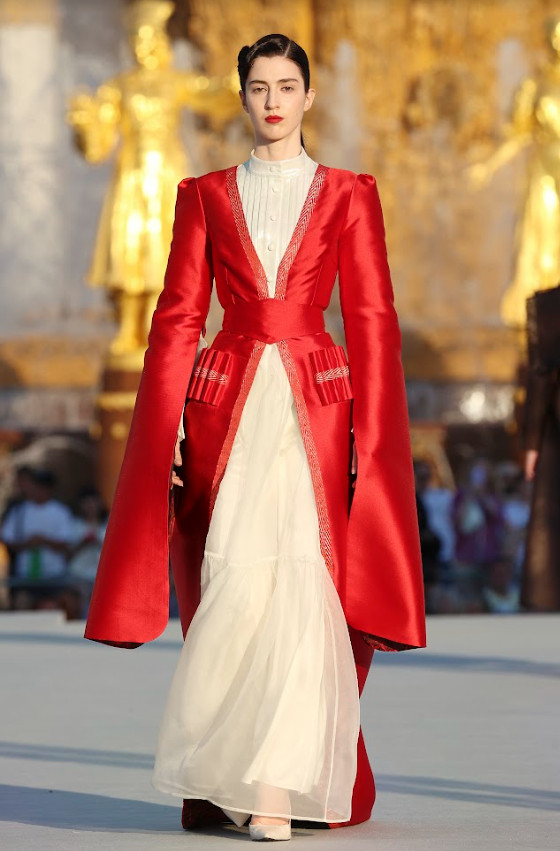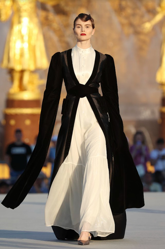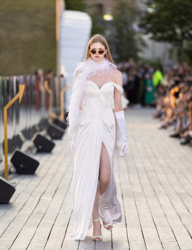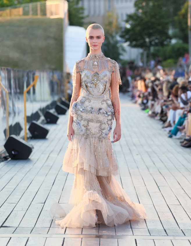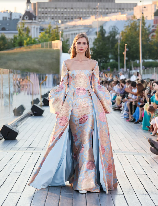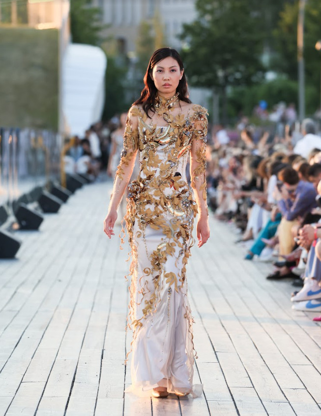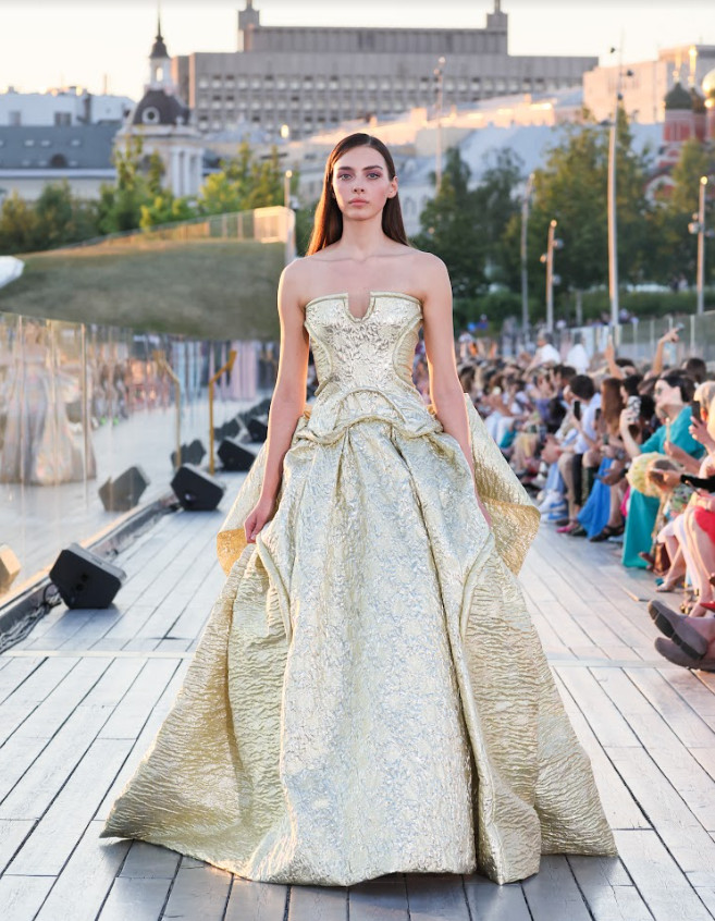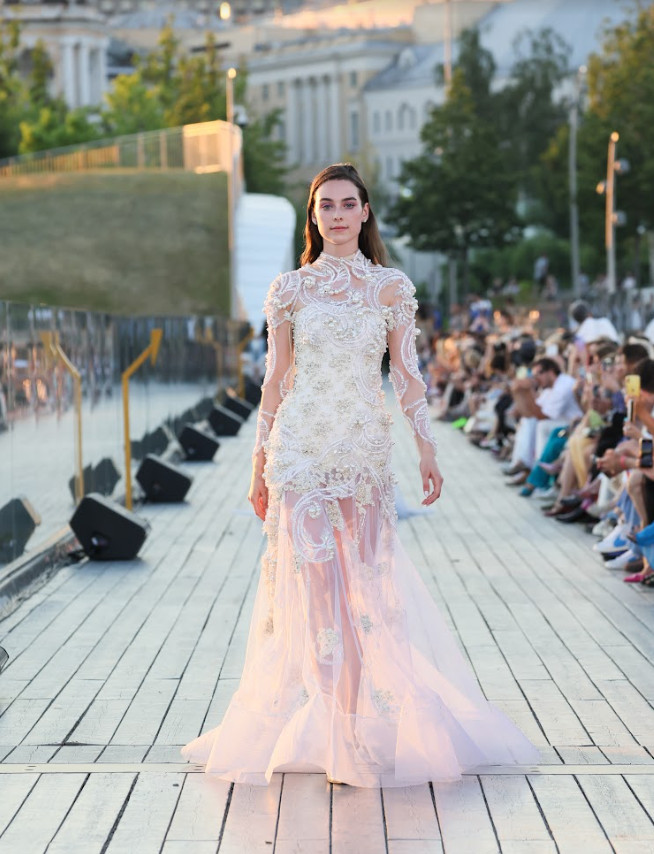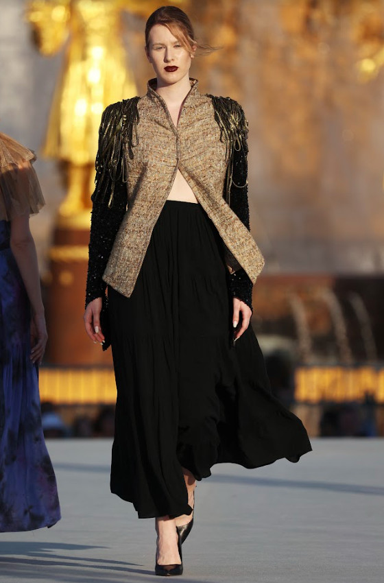 Valentin Yudashkin presented his Haute Couture 2022 collection at the Floating Bridge in Zaryadye Park. The fashion master was inspired by high jewelry art of Bvlgaru House which has been working for 130 years already. The overcoats with precious stones or extensive sleeves, shimmering jackets and suits, floor-long dresses, and jacket-dresses with prints, palazzo pants made of streamy fabrics, and tailed capes looked especially remarkable against the sunset lights. Some of the looks were topped with balaclavas and collars decorated with handmade embroidery. The highlight of the collection were dresses patterned with precious stones, decorated with natural pearls, embroidered with beads, all of these featuring black and gold. Draperies, sophisticated contours, impeccable shapes, careful work with fabrics, and production quality were – as always – best of the best. During this show, beauty, elegance, grace, and top quality ruled the day.