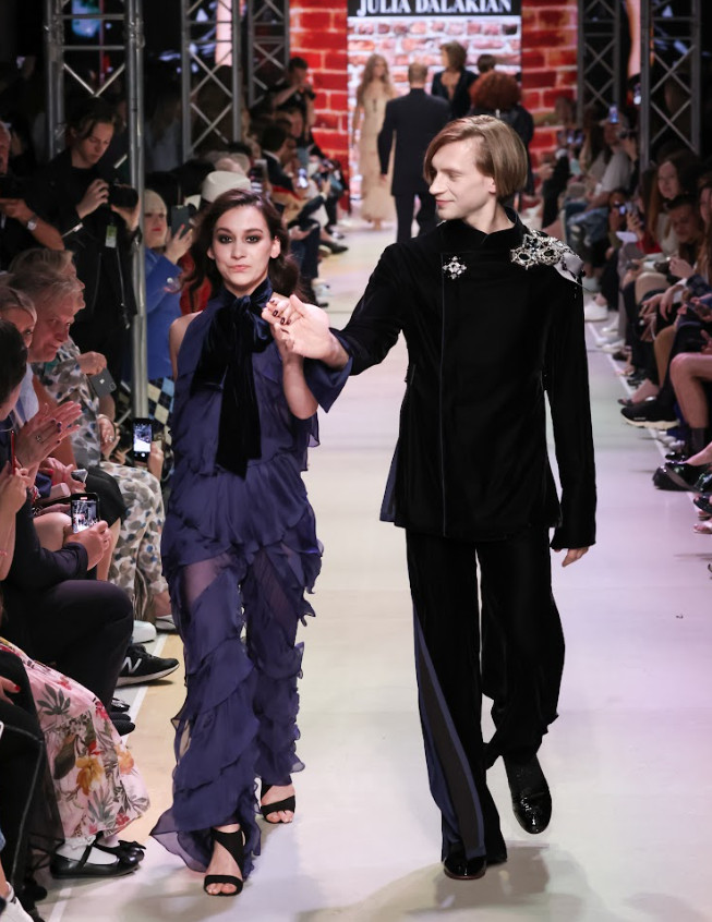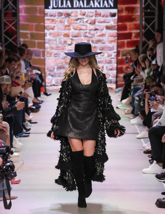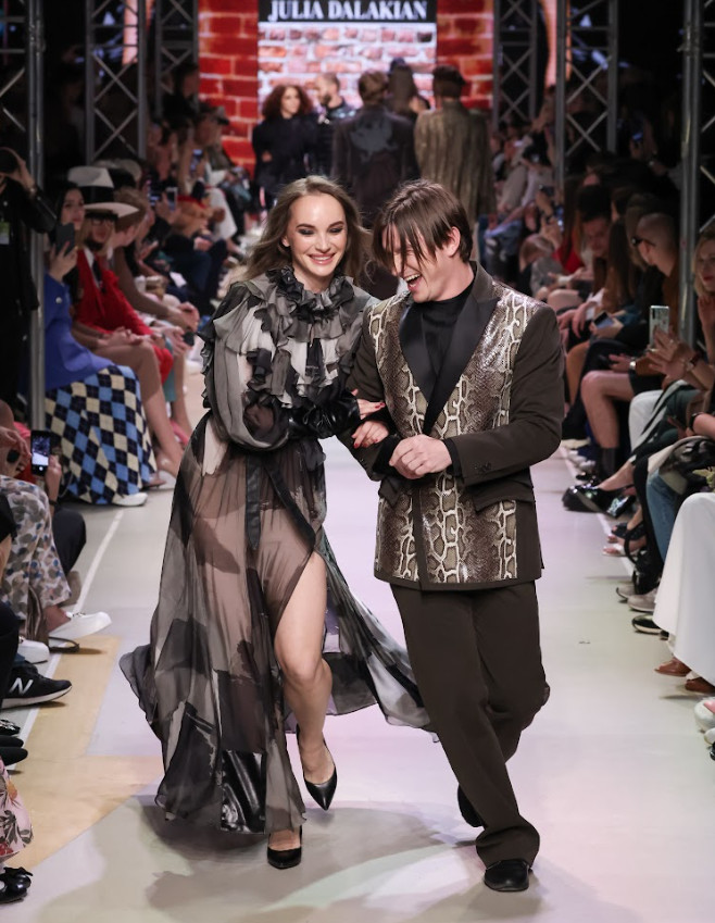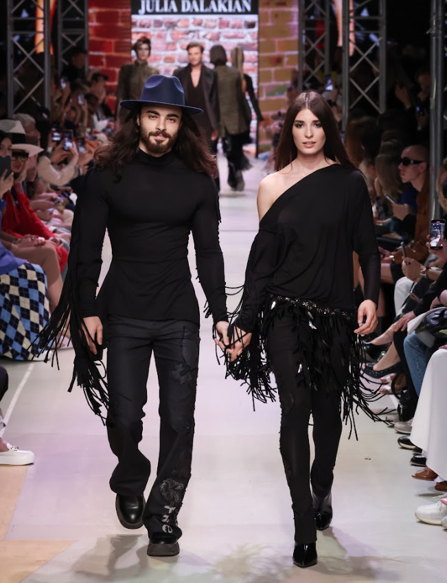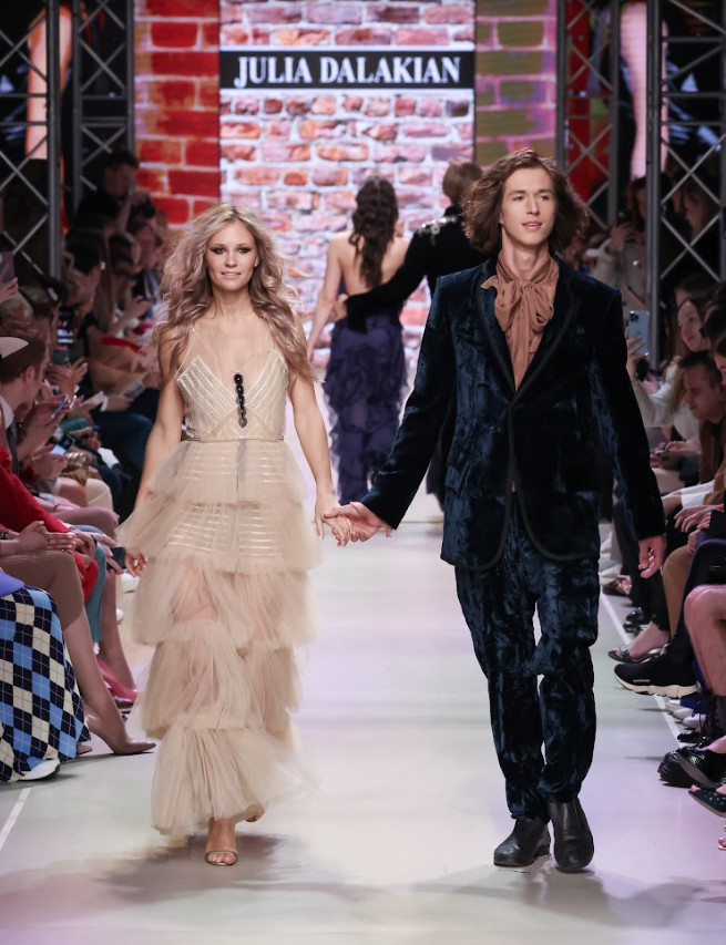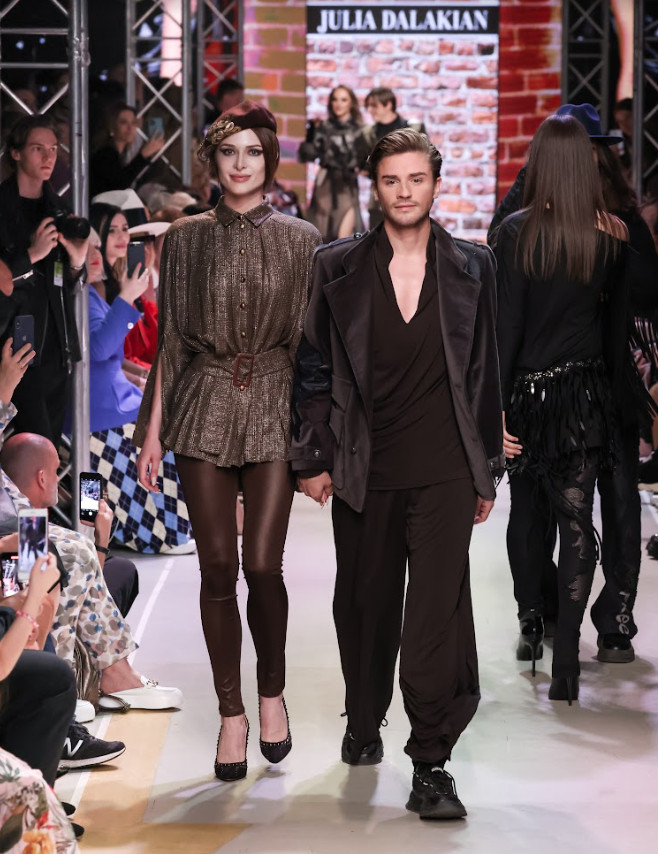 At Moscow Fashion Week, Julia Dalakian for the first time ever presented both men’s and women’s wear at once. The show started with a spectacular video performance and was inspired by the Rock Cafe atmosphere and was packed with popular quotes from ‘70s. Velvet was accompanied by smooth chiffon, leather – by fringes, and sequins – by tweed. Key models of the womenswear were leather minis and Bohemian midi and maxi volant dresses. Menswear mainly included suits, wide trousers, velvet pilot jackets with designer appliqués, as well as suit coats decorated with screen prints. The models covered the final walk in pairs, presenting trendy double looks, which emphasized the general concept of the collection even further.