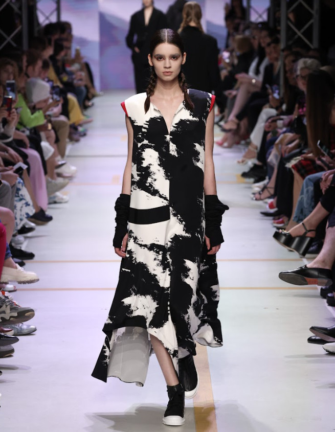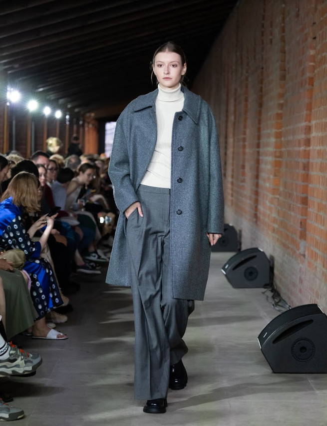 Day 4 of Moscow Fashion Week was closed by the Moscow-based brand White Crow, a follower of Japanese aesthetics. Their show took place in Zaryadye Park. Typical features of the brand are minimalism, simple shapes, lines, laconic colors and textures. Designers Nata and Anton state their motto as follows – Staying at the moment, be here and now. Comfort is in the first place – clothes should be practical. This men’s and women’s wear collection posted uniqueness through poligonal print design and thoroughly selected fittings. Overcoats, trenches, black and white T-shirts, cropped pants – none of these looked boring thanks to the game of shapes and proportions. Another feature of White Crow is care about the customer: they thoroughly test all their garments before putting them on sale.