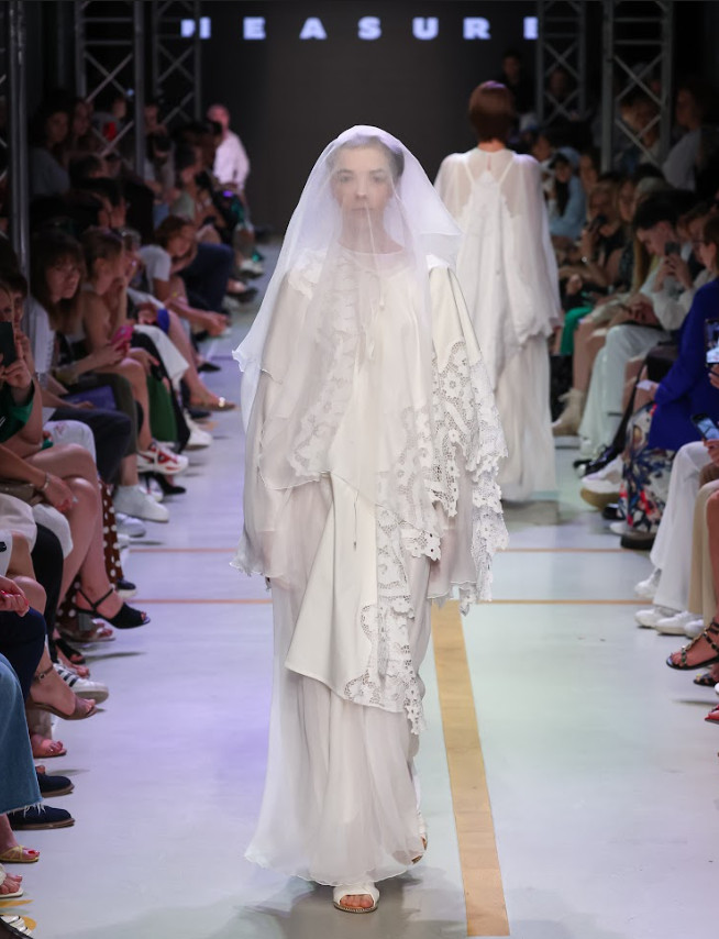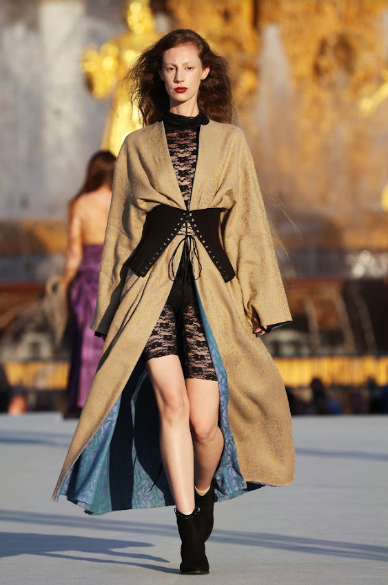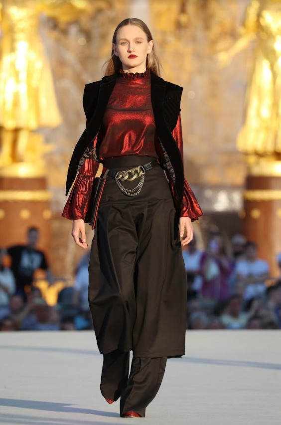 The new collection of the brand took the showgoers to the age of Rene Lalique, the jeweler. Images of jewelry pieces made by this glass designer on backs and sleeves of the garments became tickets to the time machine. Basic materials of the collection were Italian corduroy and finely radiant viscose. The catwalk was full of aery tops with draperies, asymmetrically cut blouses, corduroy suits with loose rims, wide streamy pants, and semi-tight skirts. The key accessory in most of the looks was transparent veil.