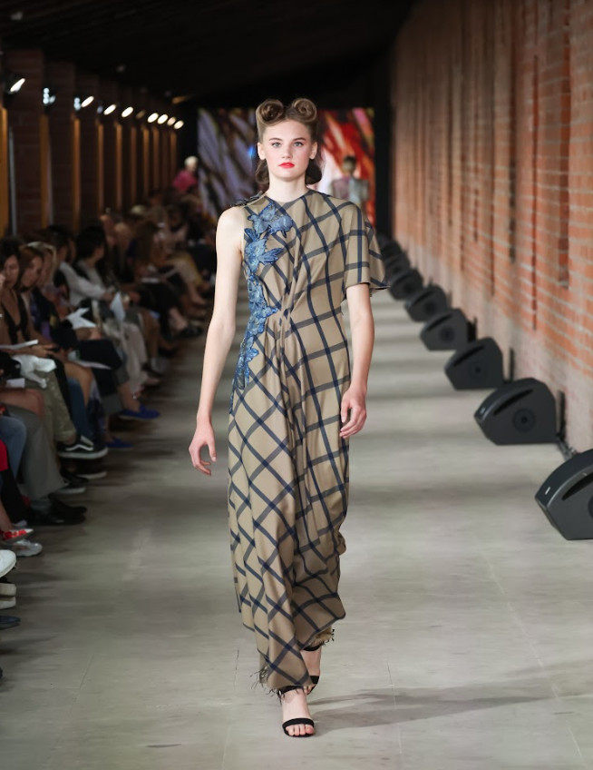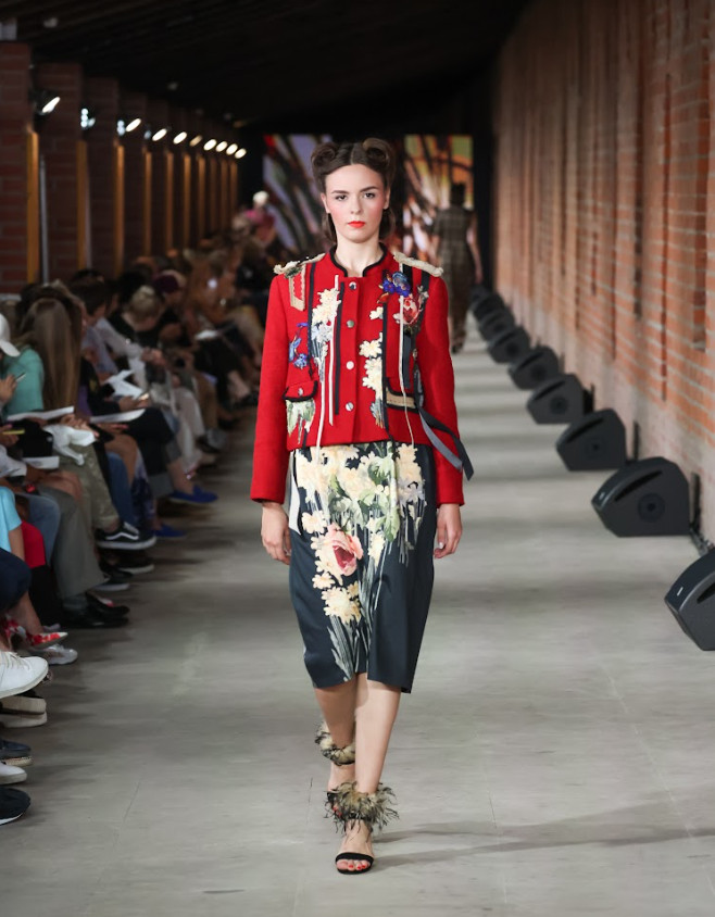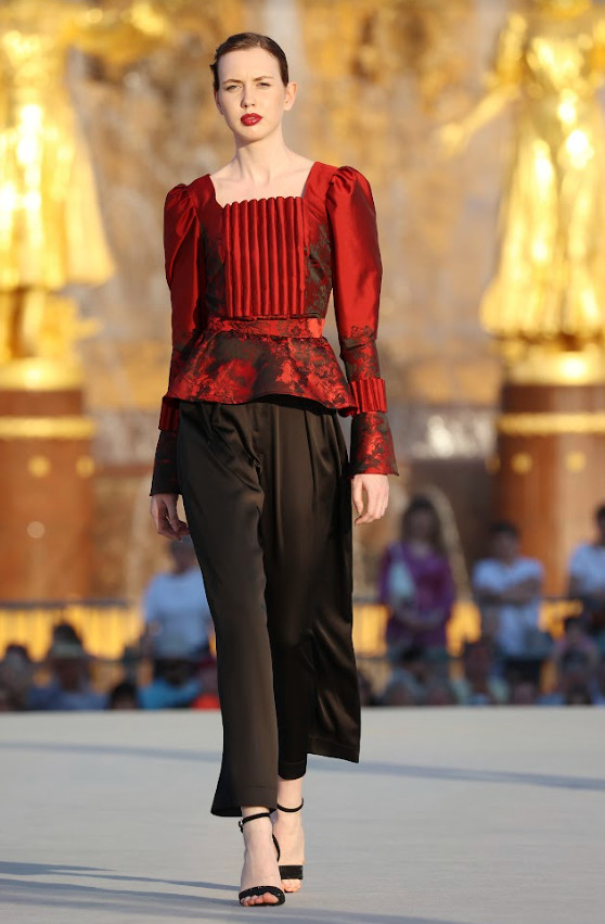 SERGEY SYSOEV presented their show at the Kitaygorodskaya Wall. Models walking down the catwalk presented vivid floral prints, dresses, skirts, and blouses embroidered, checkered pinafore dresses – natural-colored, overcoats, men’s suits with large flowers, and shirts. The basic print and the keynote of the collection was large chequers in various configs and combinations. Sophisticated hairdos of the models – victory rolls – were quite remarkable and perfectly topped austere and elegant looks. The color palette was a somber one – brown, beige, black with some highlights added by red poppies and other blossoms.