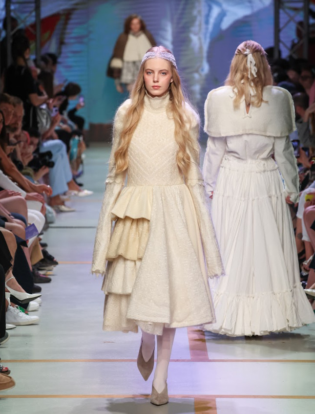 AKHMADULLINA presented their special collection at Moskvoretskaya Embankment in Zaryadye Park. Alyona Akhmadullina – founder of the brand – referred to her favorite subject, the Russian costume, aiming to integrate tradition into everyday life. The designer used traditional cuts and typical decorations in her looks, but presented them at a different angle. The keynote of the collection was the traditional Russian extensiveness. Alyona hypertrophied it and presented airy silhouetted with somber pastel hues and caramel-colored embroidery. Floral motives from old times were arranged in pixels and made with a contemporary method – 3D embroidery with one-colored thread. Extensiveness was accompanied by quilting and stitching – in quilted jackets, suits, and fur coats. Besides, the collection comprised many warm knitted garments. The more models walked down the catwalk, the more vivid the colors got. Every look was extended with the usual braids and kokoshniks in pertinent pink.