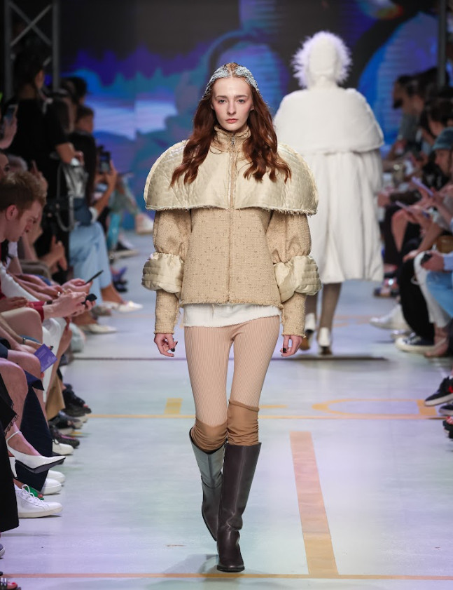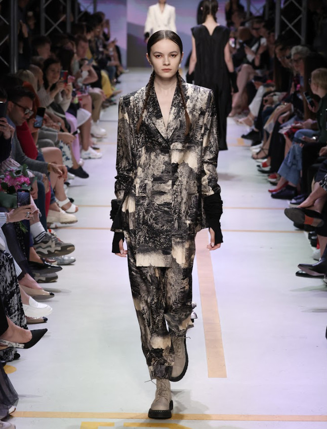 The brand from Buryatia established by Nadezhda Abzaeva, presented its collecting merging the real world and the 3D reality. The show started with some atmospheric video art, and then the 1st model wearing a floor-long overcoat and a balaclava hit the road. The collection comprised bomber jackets with extensive long sleeves, peculiar puffed tops, slim one-piecers, texturized jackets, cropped shirts, and asymmetric dresses. Carefully selected shapes of every piece had their part in making the looks refined. Basic colors of the collection were greyish beige and black. The prints were tie-dyed manually, and water for painting them was used in all its three aggregate states – fluid, ice, and vapor.