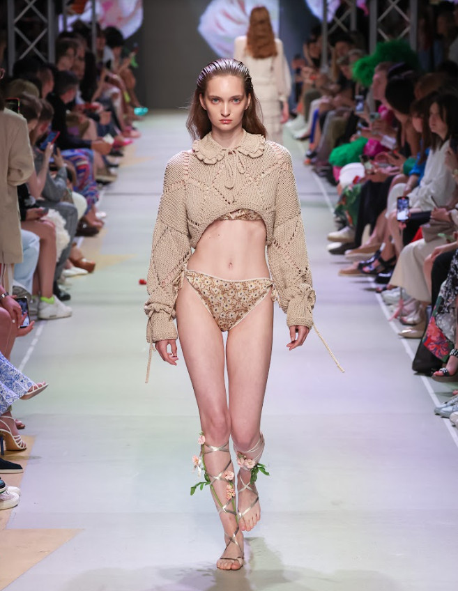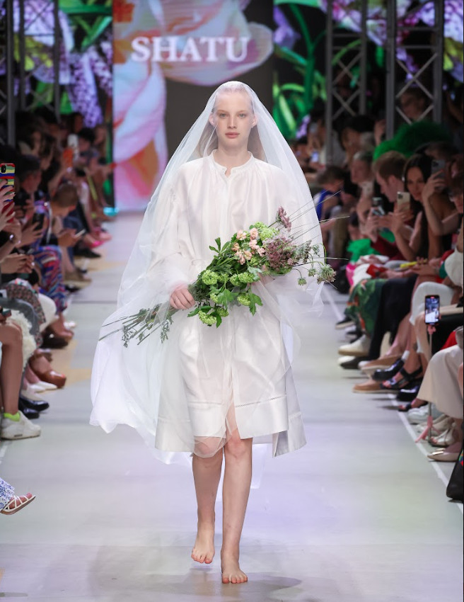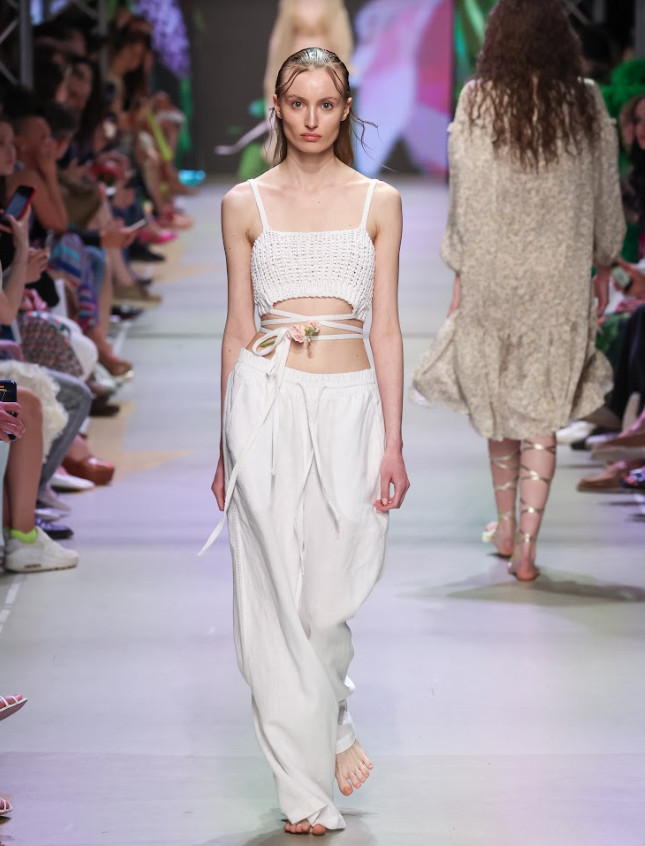 Designer Svetlana Shatunova presented a sea cruise like collection, inspired by Pre-Raphaelite paintings and her vision of a she-Muse. In her line, classic silhouettes were merged with airy fabrics and floral prints, granting the collection a light and easy spirit. Models walked down the catwalk in trouser suits, romantic dresses – laced and fringed, knitted bra and shorts, pajama-style sets, and a super-light organza trench coat. The final chord was the wedding look – a minimalist dress with a gentle veil.