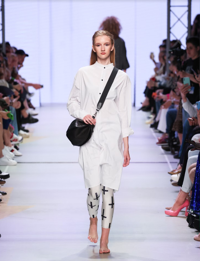 Renewal 2.0 is the second big collection by the brand. Its name features the brand’s development vector, and the designer’s mood, too. The garments were mainly sportswear although not lacking some sexiness. At the same time, most of the looks were designed as unisex ones. The designer parlayed jersey, and this collection comprised slim silhouettes which laid emphasis on body contours. Men’s and women’s bicycle shorts with contrasting inserts were accompanied by all kinds of outerwear with vivid structural and decorative elements. Sportswear was presented along with classic models like oversize jackets, blouses, and pants. Basic colors were white, black, and grey, although flared up with bright tints of yellow, green, blue, orange, and lilac. Minimalist embroidery, prints with logotypes, rubber-boated fitting – all of these made perfect decorations. Accessories are also worth noting – logotyped kerchiefs, embroidered caps, and designer jewelry. The show was accompanied by a sound track specially designed for the presentation. The clothes were offered for sale right after the show – see now, buy now.