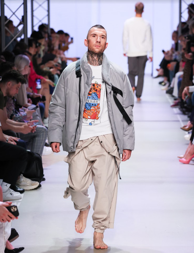 Another emerging brand from the capital brought its collection to the catwalk at Zaryadye Park. This was something of a show that started with dancing and ended with it, too. Models walked down the catwalk to dynamic music, presenting men’s and women’s outwear – hoodies, T-shirts with timely inscriptions and prints, cargo pants, bomber jackets, and open shoulder dresses. The color palette featured black and khaki. Playing with shapes, texture, and decorations, the designer managed to create hooliganish sets, featuring punk and streetwear aesthetics.