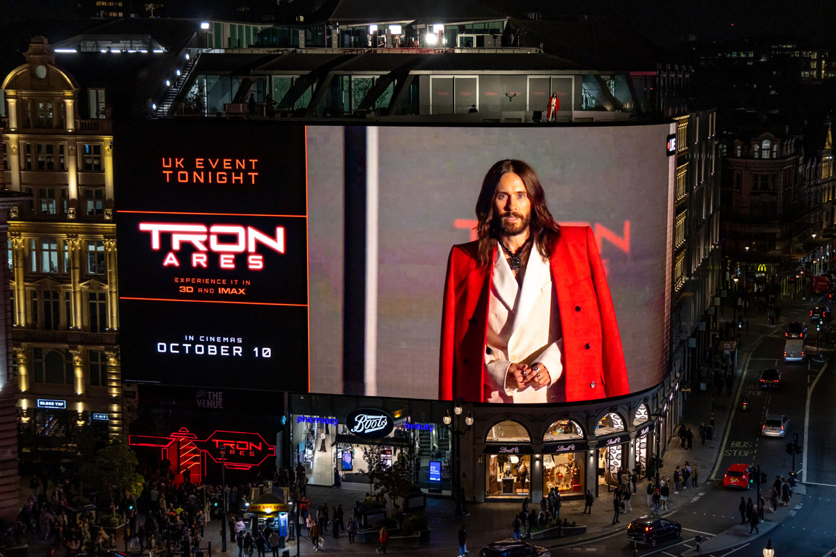 Wednesday 1 October, 2025: This evening Disney Studios transformed the Piccadilly Lights into the electrifying world of TRON: Ares, staging the first-ever rooftop red carpet above the iconic Lights. Standing above the London landmark, Jared Leto unveiled exclusive 3D TRON: Ares content live on the giant screens as crowds gathered below to watch. Jared Leto was joined on the rooftop by director Joachim Rønning and cast members Greta Lee, Jodie Turner-Smith, Evan Peters and Gillian Anderson, creating a truly historic moment.