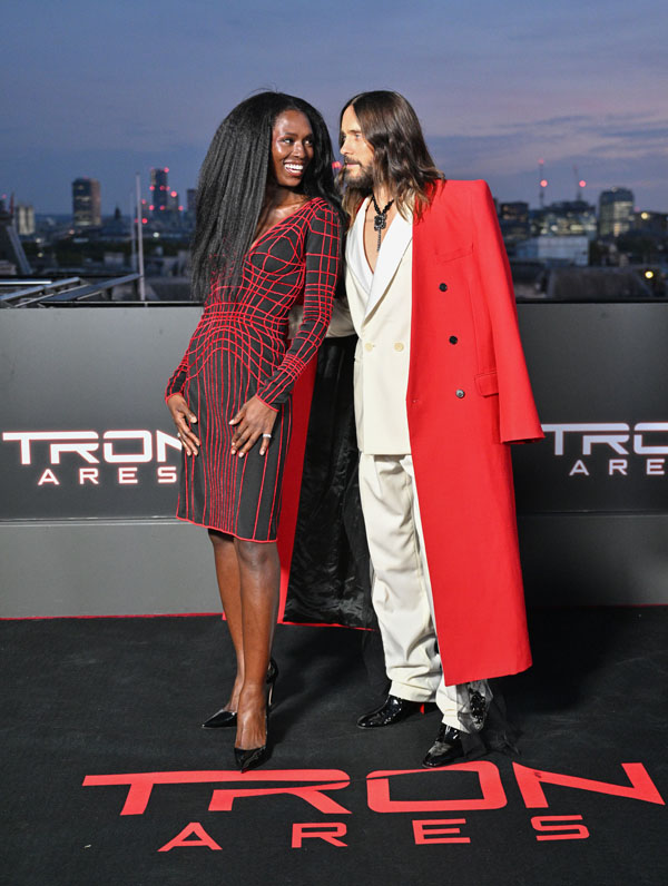 LONDON, ENGLAND – OCTOBER 01: (L-R) Jodie Turner-Smith and Jared Leto attend the UK Event of Disney’s ‘Tron: Ares’ at Piccadilly Lights, London on October 01, 2025 in London, England. (Photo by Samir Hussein/Getty Images for The Walt Disney Company Limited)