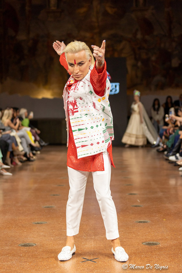 The collection, which masterfully blends elements of Indian culture with contemporary fusion design, captivated international audiences and garnered extensive media coverage. Held in one of Milan’s most glamorous venues: I Chiostri Di San Barbara, the fashion show drew a global audience of high-profile guests and industry experts.