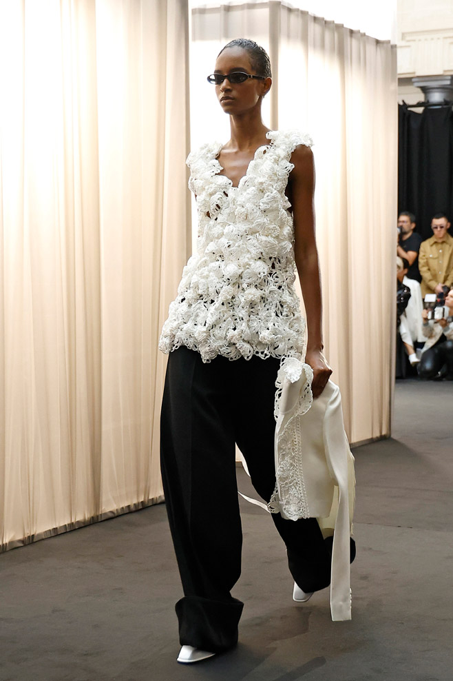 Once signifiers of restriction and formality, delicate, nostalgic garments of the past transform into powerful tailoring pieces suited for the women of today. Intricate lace detail and strong volume inspired by nostalgia meet beloved silhouettes taken from the EENK archives and create unexpected structure and confidence. Hand-knitted vintage corsage dresses and long shirting, powerful trousers and jackets, soft cyanotypes and sleek suiting remind us that today, femininity and power are in the same room. EENK presents also some menswear look through this collection, expressing also delicate items for a menswear wardrobe.