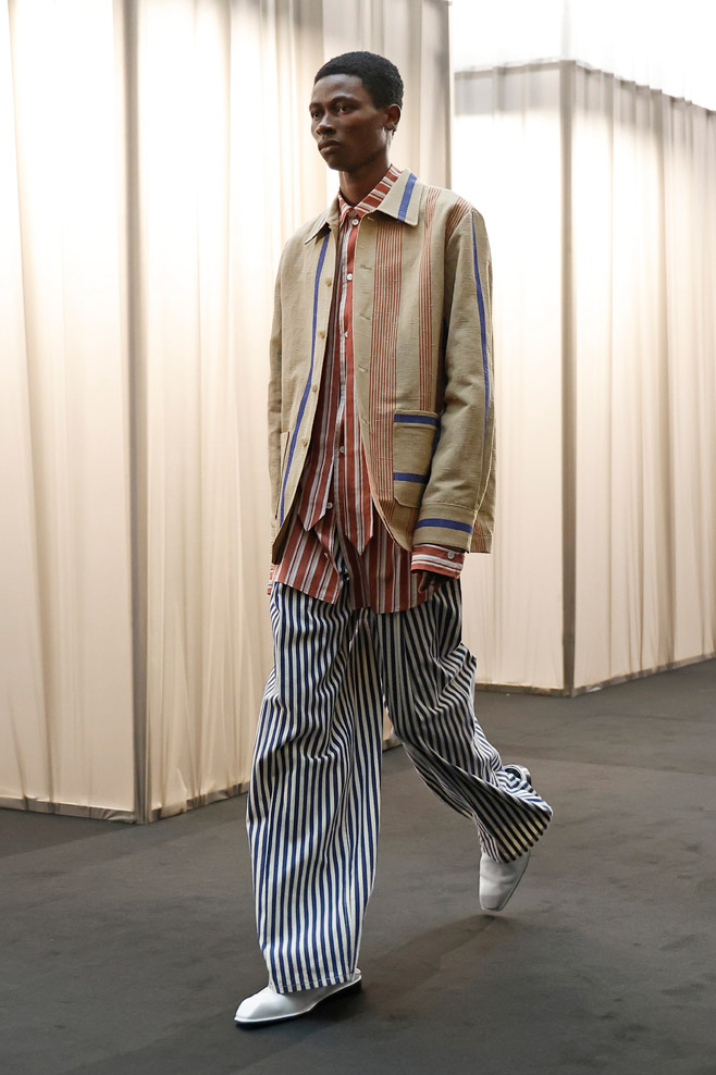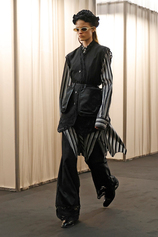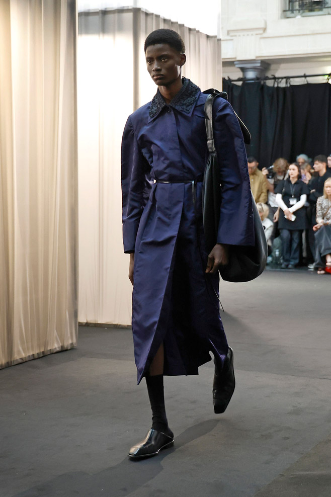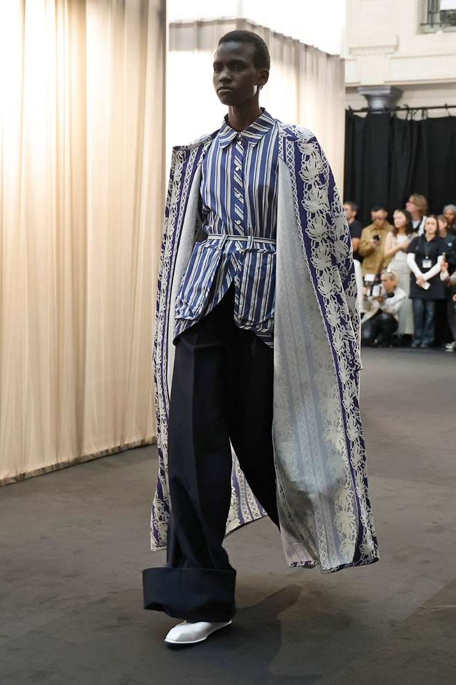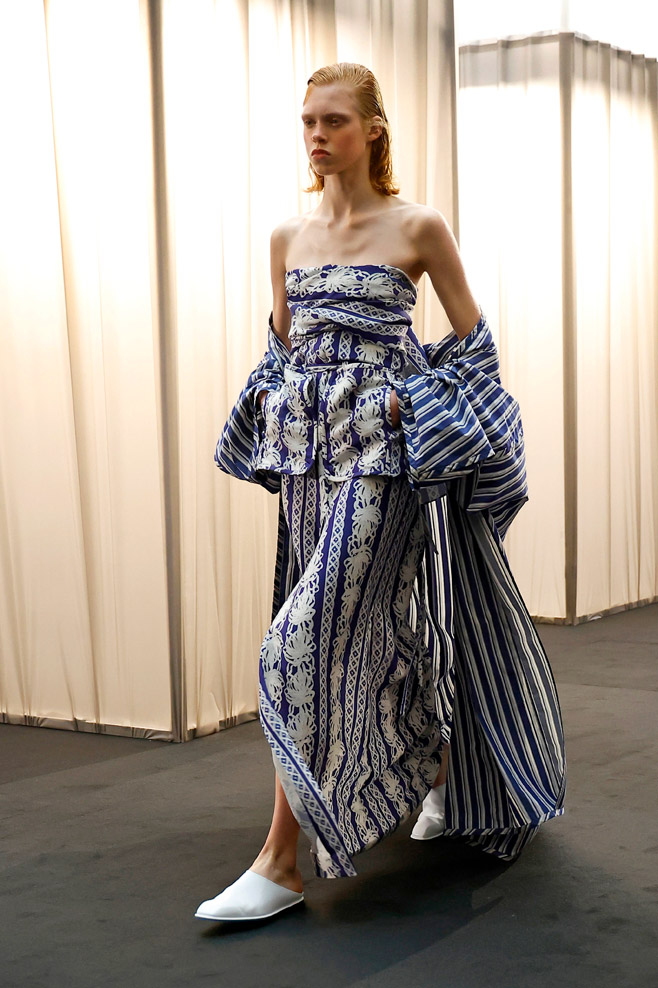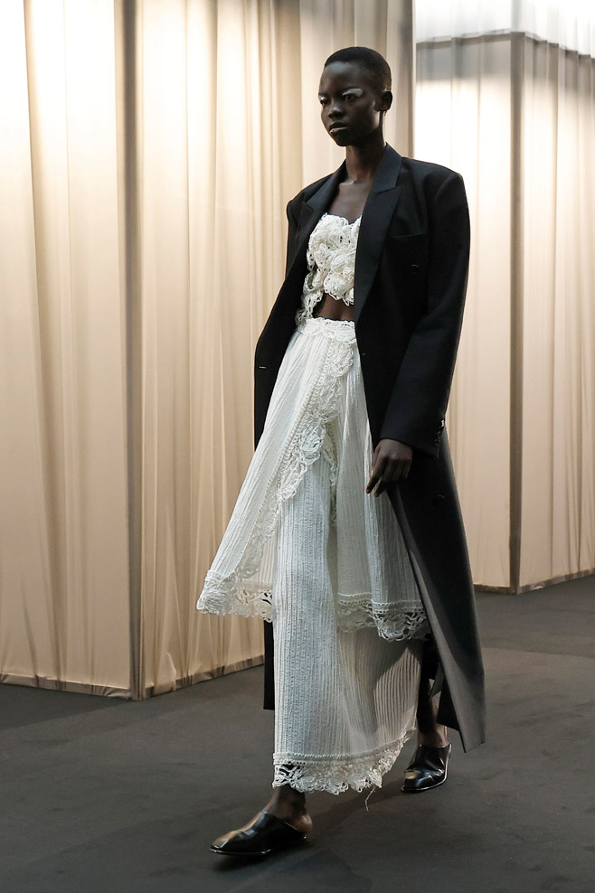 Once signifiers of restriction and formality, delicate, nostalgic garments of the past transform into powerful tailoring pieces suited for the women of today. Intricate lace detail and strong volume inspired by nostalgia meet beloved silhouettes taken from the EENK archives and create unexpected structure and confidence. Hand-knitted vintage corsage dresses and long shirting, powerful trousers and jackets, soft cyanotypes and sleek suiting remind us that today, femininity and power are in the same room. EENK presents also some menswear look through this collection, expressing also delicate items for a menswear wardrobe.