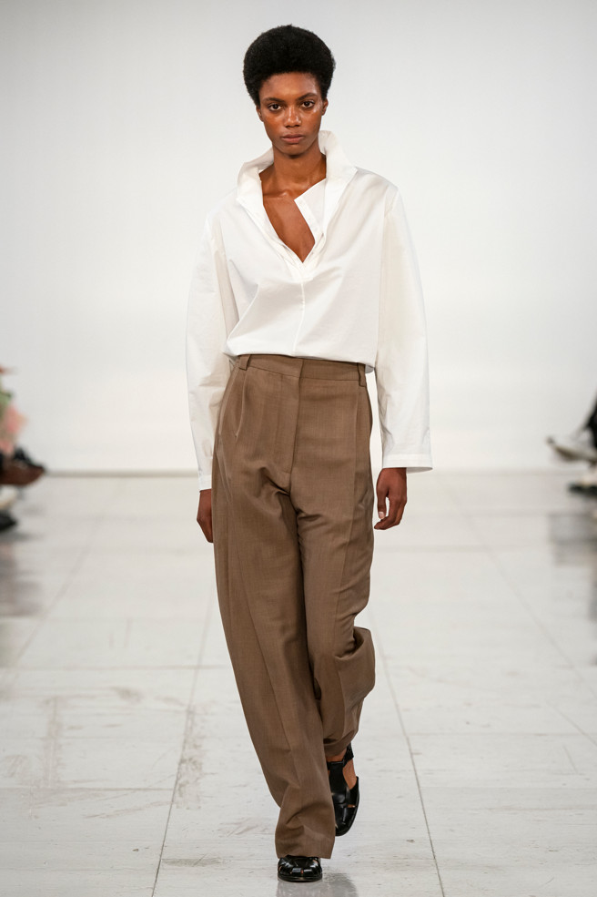 Trousers are loose and relaxed; smart-casual Bermuda shorts come in camel and navy; mini skirts made of wool and cotton, are similar breezy.