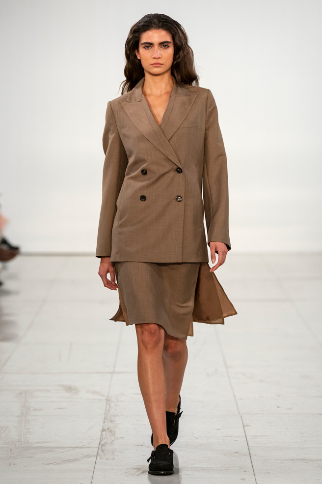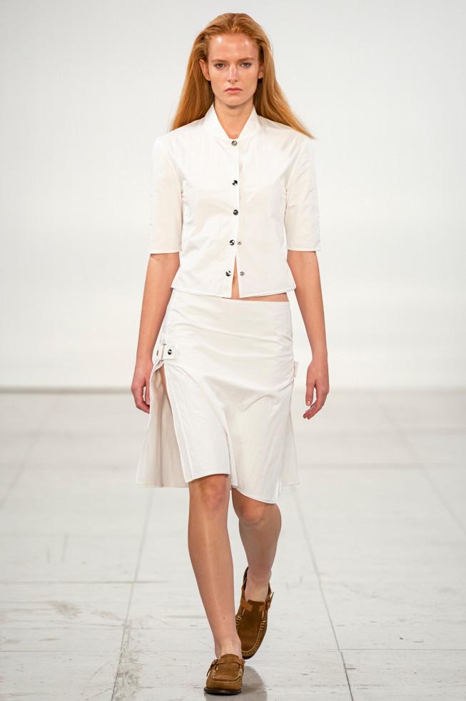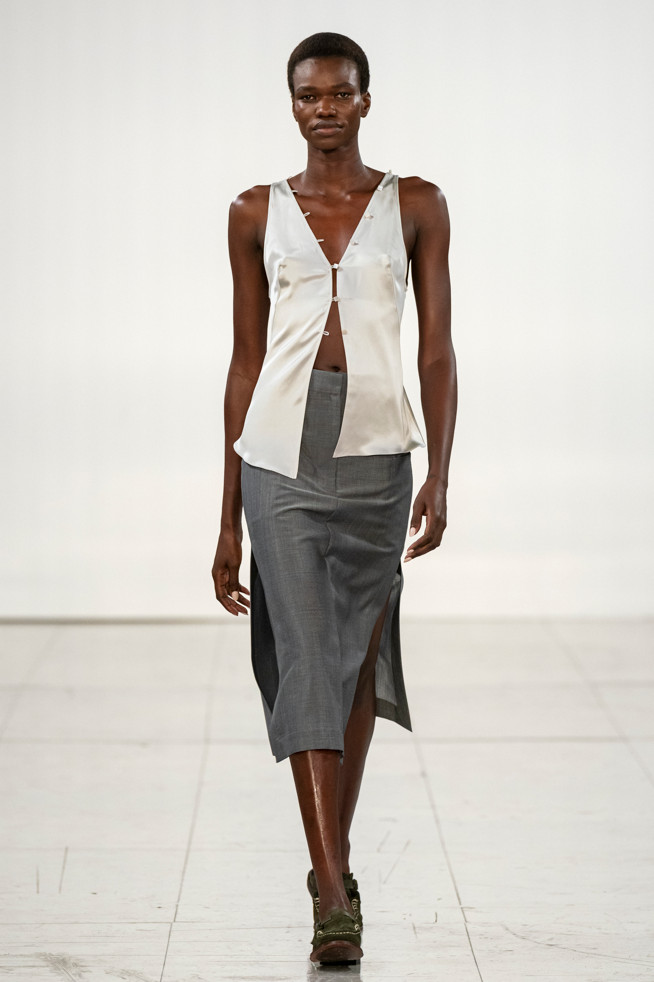 Building on the previous season’s satin silk cutouts, double slashed bronze dresses are held together by buttons and loops. Cami-shaped tops and slips skirts in bronze and duck egg follow the same form.