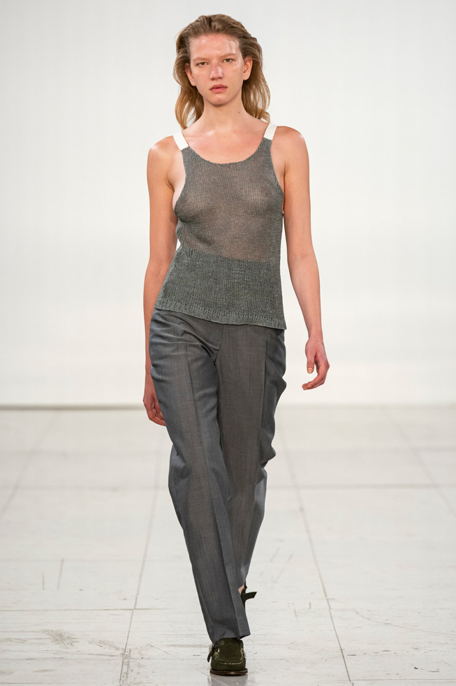 Knitted pieces have both a ‘liquid’ and stiff effect: 2D-looking tank tops, luscious jumpers and vest resembling paper, are surprisingly made from treated Japanese 100% linen yarn.