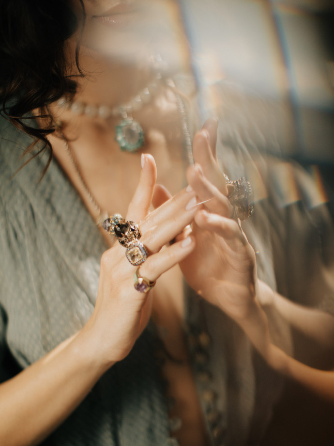 Okutova’s showroom is nothing like those of posh jewellery galleries. It would leave an impression of a small living room with warm coloured walls with mirrors and sketches on the walls and shade separating common area from improvised entrance hall. If not a layered cake-like stand covered with rings and mounted on a coffee table between sofas, you couldn’t tell it’s a trade place. Everything is made to accommodate the jeweller’s clients, team and friends. It’s really impossible to say who’s sitting next to you and discussing the treasures because everyone seems familiar enough to exchange news and opinions about the jewellery, events, people or places. Whenever you come you feel belonging to the circle of beautiful, talented and creative people. You are not intimidated by anything or anyone.
