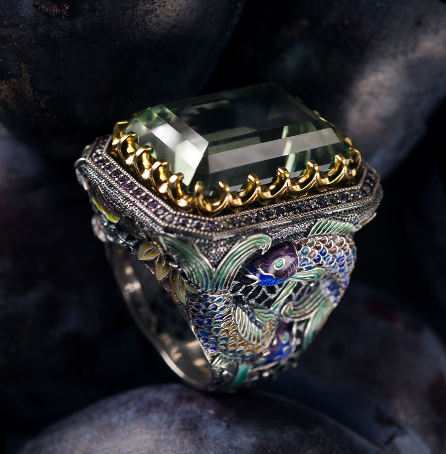 It’s obvious that what she does is not just sketching and general management of the masters team working for her. She is so a part of the creative process that when you talk with her you discover the way she solved the trickiest moments of metal work or enameling. One ring might have 3-4 innovative techniques on top of a traditional technique and she articulates the whole story behind every tiny detail you wouldn’t even read as a key stone of the construction. Rarely the process of production sounds as adventurous and involving as in her tales. You can literally feel the enamellier’s broken spirit when he sees the baked glass fall off the silver surface.