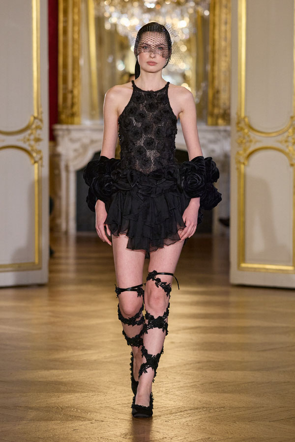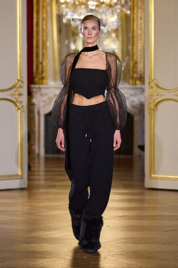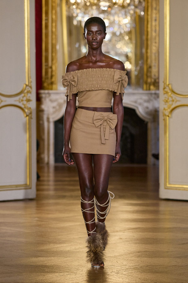 The color palette unfolds in shades of nude, black, soft grey, and patinated gold. Nude suggests intimacy, black mastery, grey clarity, while gold appears as a discreet presence, never ostentatious. Here, luxury is defined by precision: airy feathers, fine gold embroidery, and balanced structures designed to support movement and comfort.