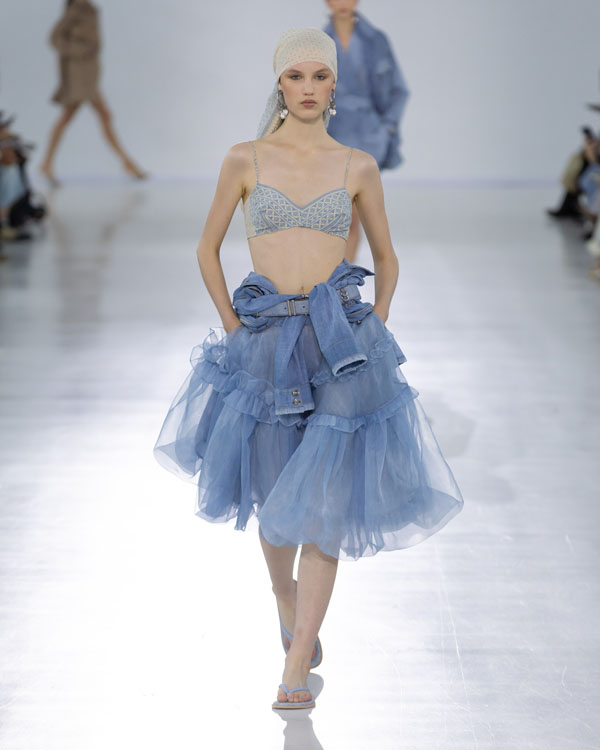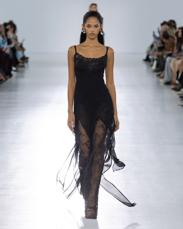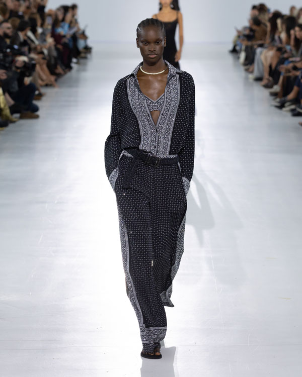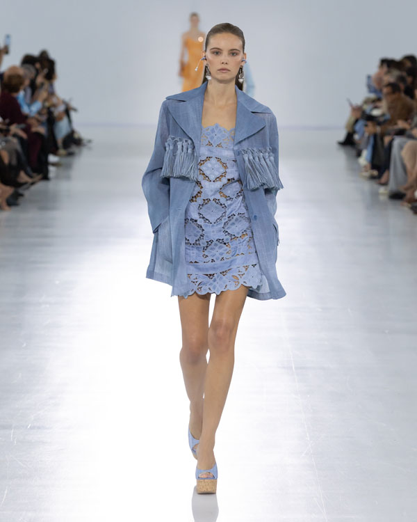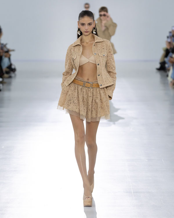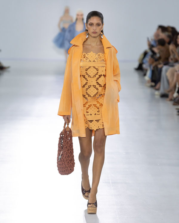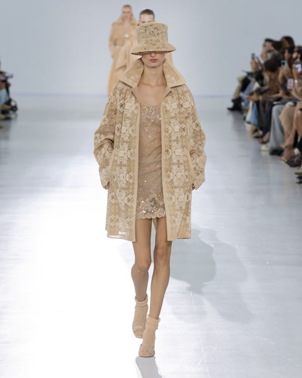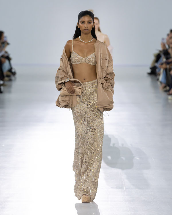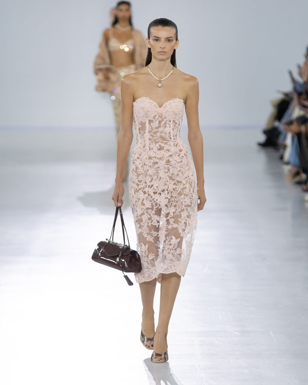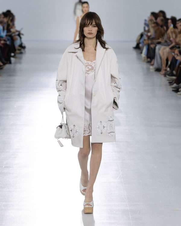 Scervino’s designs explored the beauty of transparency and structure, with lace, crochet, and crystal-encrusted cut-outs flowing like gauze across a sunlit terrace. The use of ancient “iris petal” layering techniques gave chiffon new architectural strength, while feather-light nappa was pleated into irregular forms, balancing delicacy with innovation.