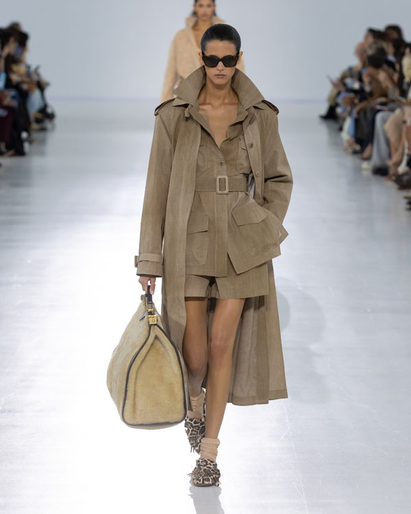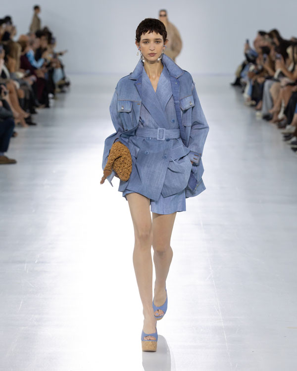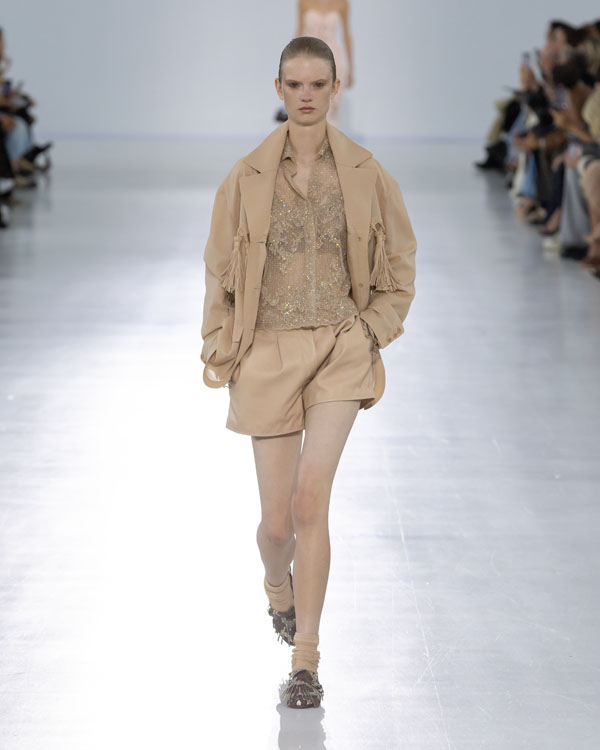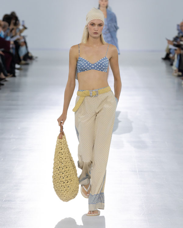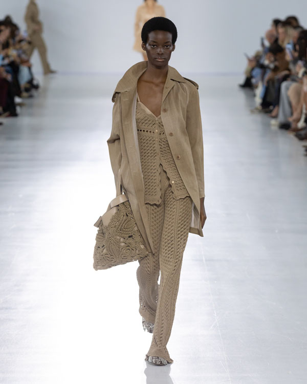 Accessories further captured this spirit of refined craftsmanship and experimentation. Woven straw, bamboo, crochet, raffia, suede, and leather came together in bags that ranged from vintage-inspired embroidery to explorer satchels. Footwear introduced playful lightness, with lace-soled flip-flops, cork wedges, fringed loafers, and embroidered sandals softening the formality of tailoring.